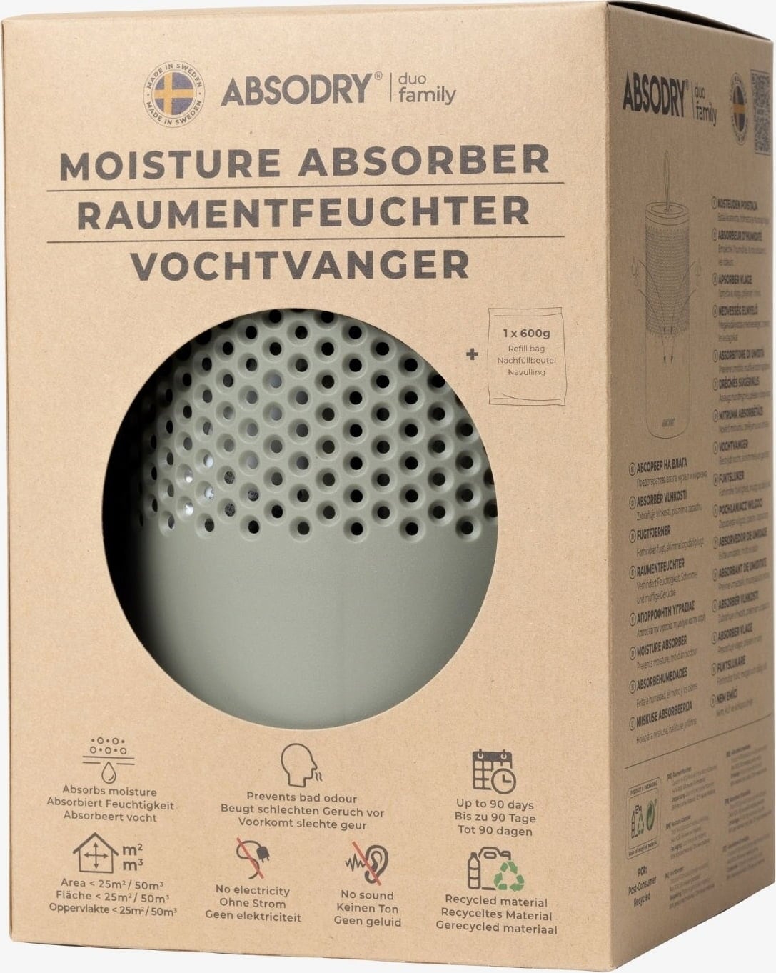 Lieferumfang: Luftentfeuchter inkl. 600 g Nachfüllbeutel mit feuchtigkeitsabsorbierenden Kristallen