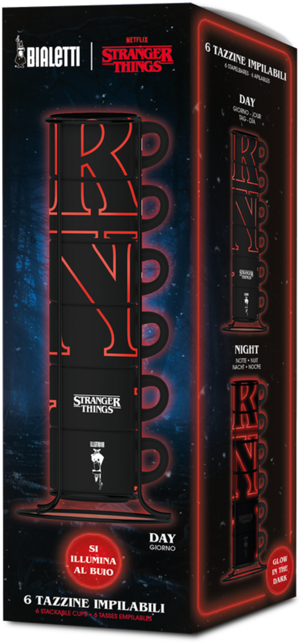 Einzigartiges Deko-Highlight in jeder Küche. Die im coolen "Stranger Things"-Look gestalteten Espressotassen, sind nicht nur praktisch im Metallgestell stapelbar, sondern leuchten auch im Dunkeln.