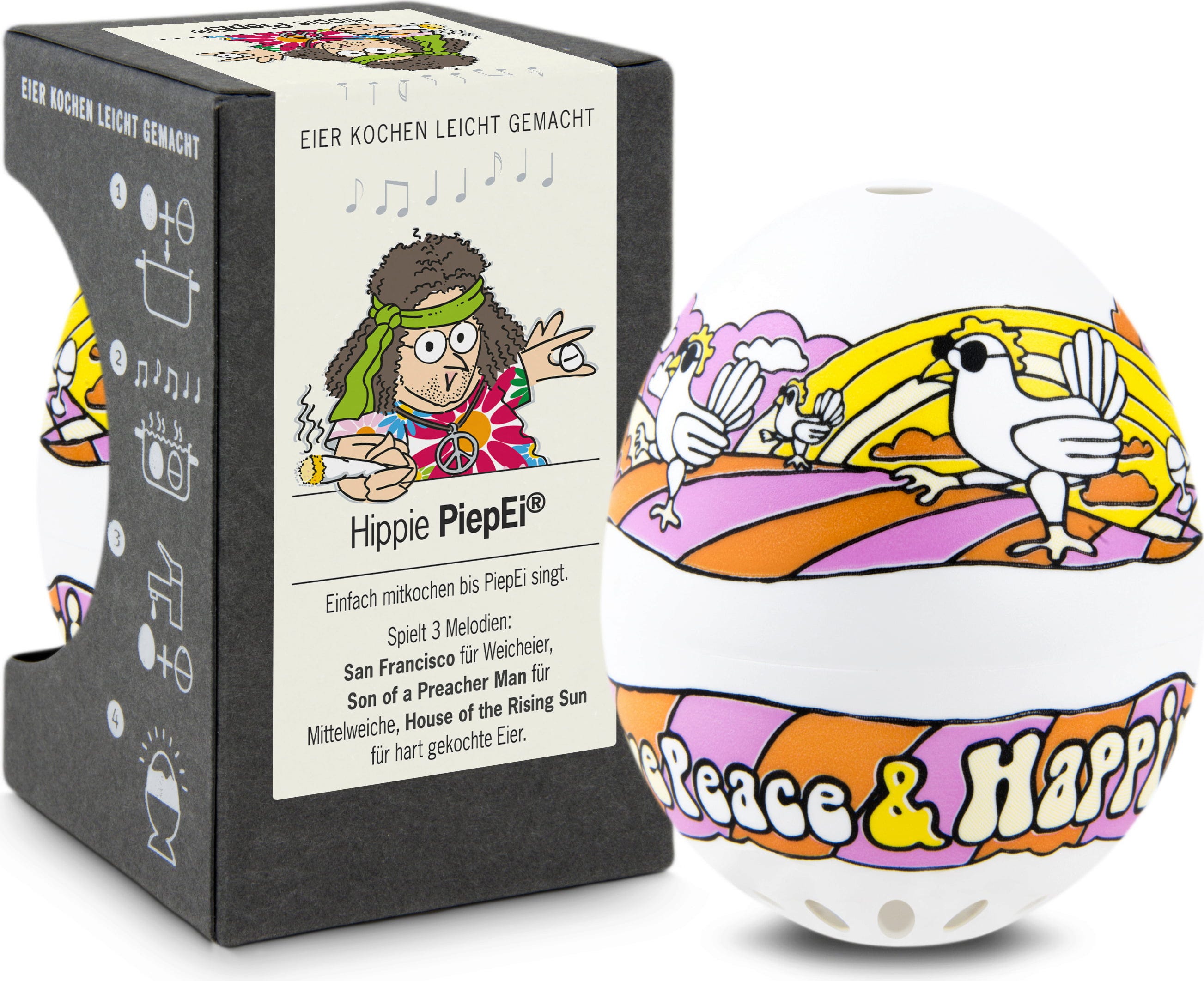 Einfach das Hippie PiepEi mit den Eiern lagern, gemeinsam kochen und warten, bis die Melodie des gewünschten Härtegrades spielt. Unabhängig davon, mit welcher Wassertemperatur man startet, welche Eiergröße und auf welcher Höhe gekocht wird.