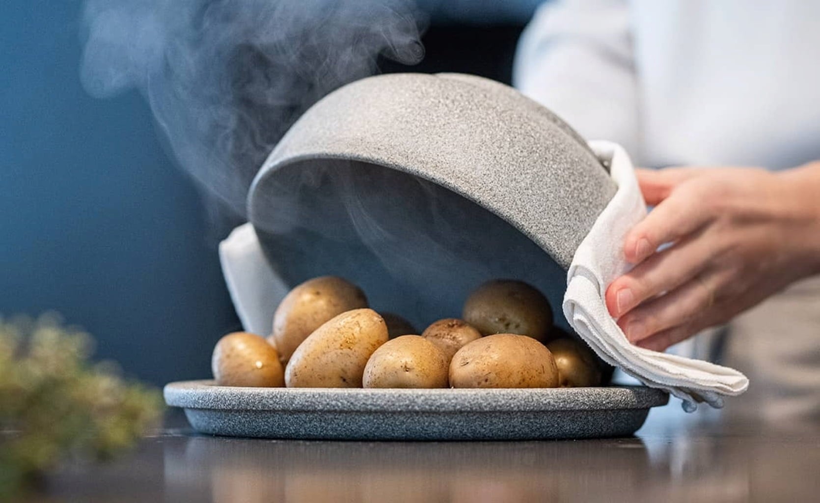 Anwendung im Backofen: Vorab eine geringe Menge Wasser zugeben und im Umluftbetrieb garen. Auf diese Weise bildet sich unter der Haube heißer Wasserdampf, während die Keramik die Hitze speichert und als Strahlungswärme an das Gemüse abgibt. Die minimale Wassermenge sorgt dafür, dass viel weniger Energie verbraucht wird, als bei der Zubereitung im Topf.