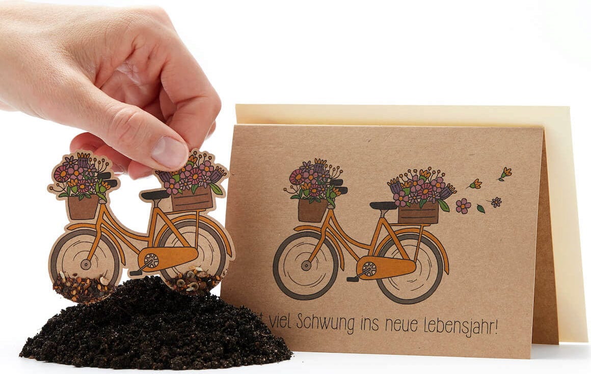 Da das Fahrrad zusätzlich auf die Karte gedruckt ist, bleibt das Motiv auch nach dem Entfernen des Saatpapiers erhalten.