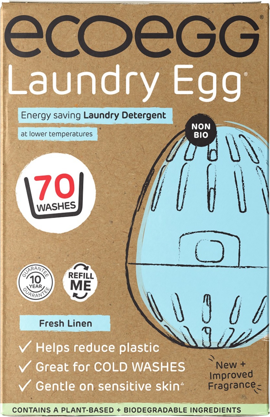 Das Wäsche-Ei eignet sich auch bestens für Menschen mit sensibler Haut, ist frei von Petrochemikalien, Enzymen, Bleichmitteln, SLS/SLES sowie Mikroplastik und bildet so einen umweltfreundlichen Weg zu sauberer Wäsche.