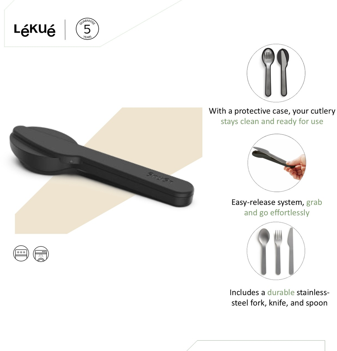 Dieses praktische Besteckset im hygienischen Etui passt in jede Handtasche, um unterwegs eigene oder gekaufte Mahlzeiten zu genießen.