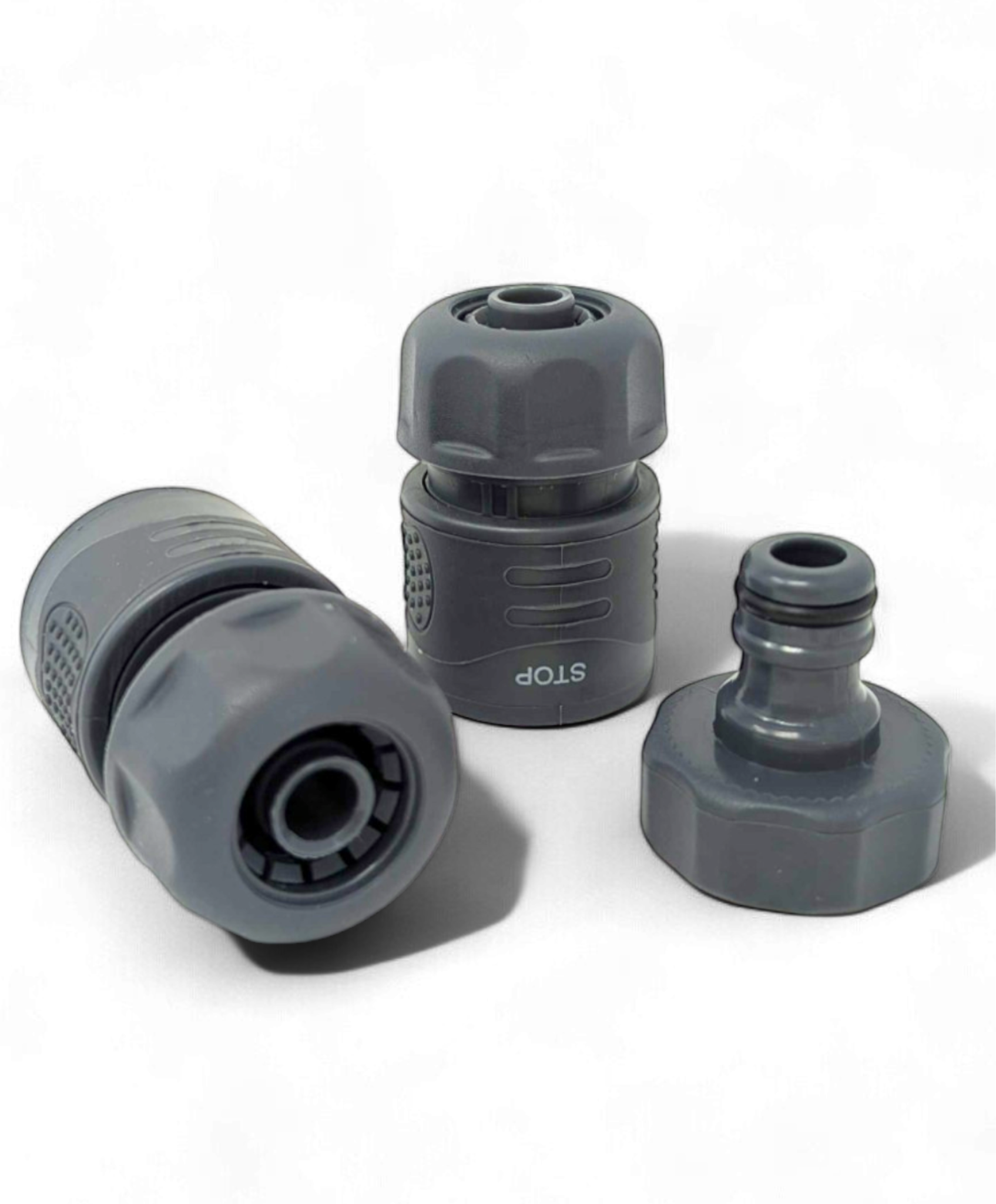 - 3-teiliges Set bestehend aus Schlauchanschluss 1/2 Zoll, Hahnanschluss G 26,5 mm (3/4 Zoll) und Wasserstop 1/2 Zoll