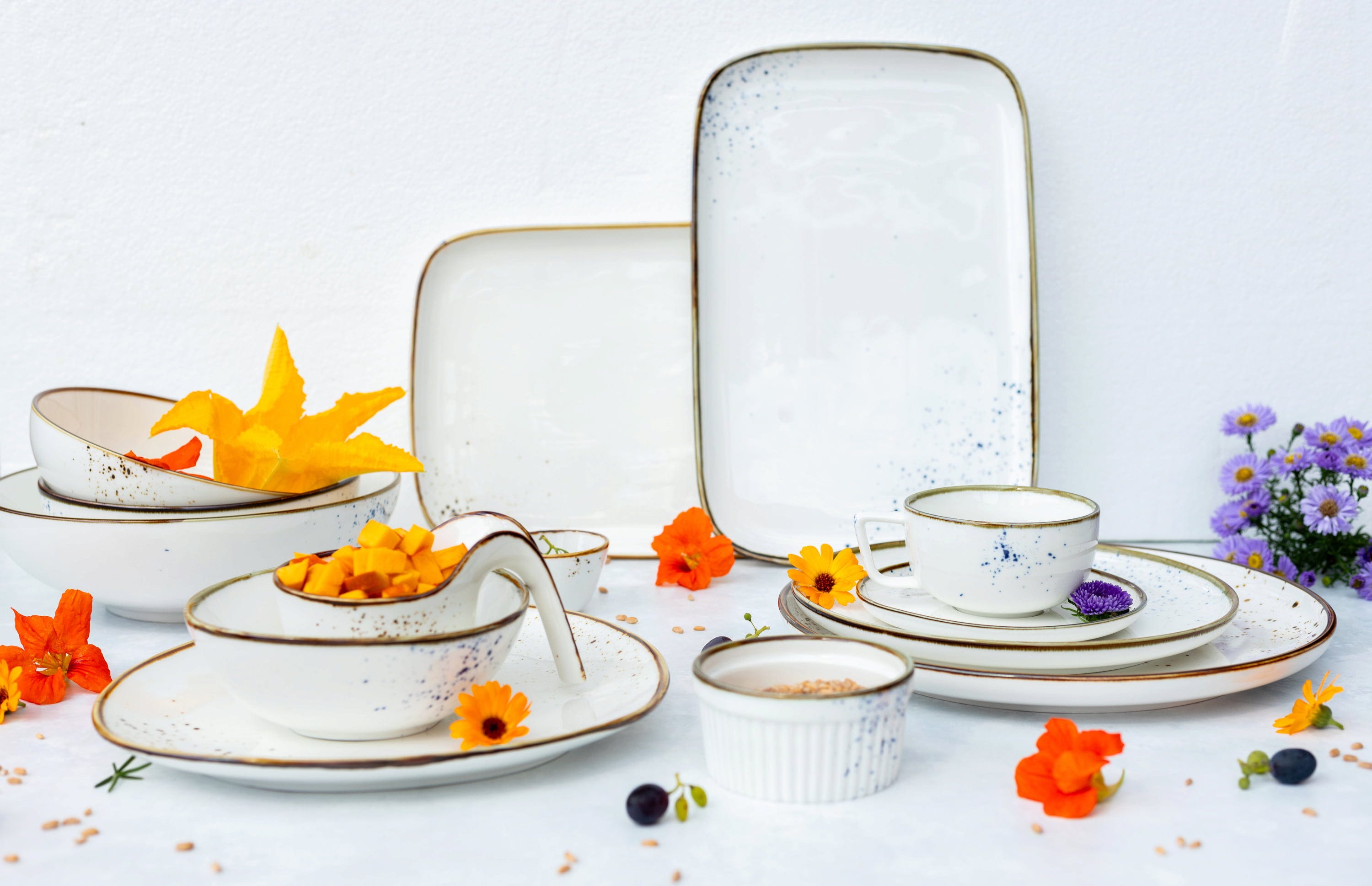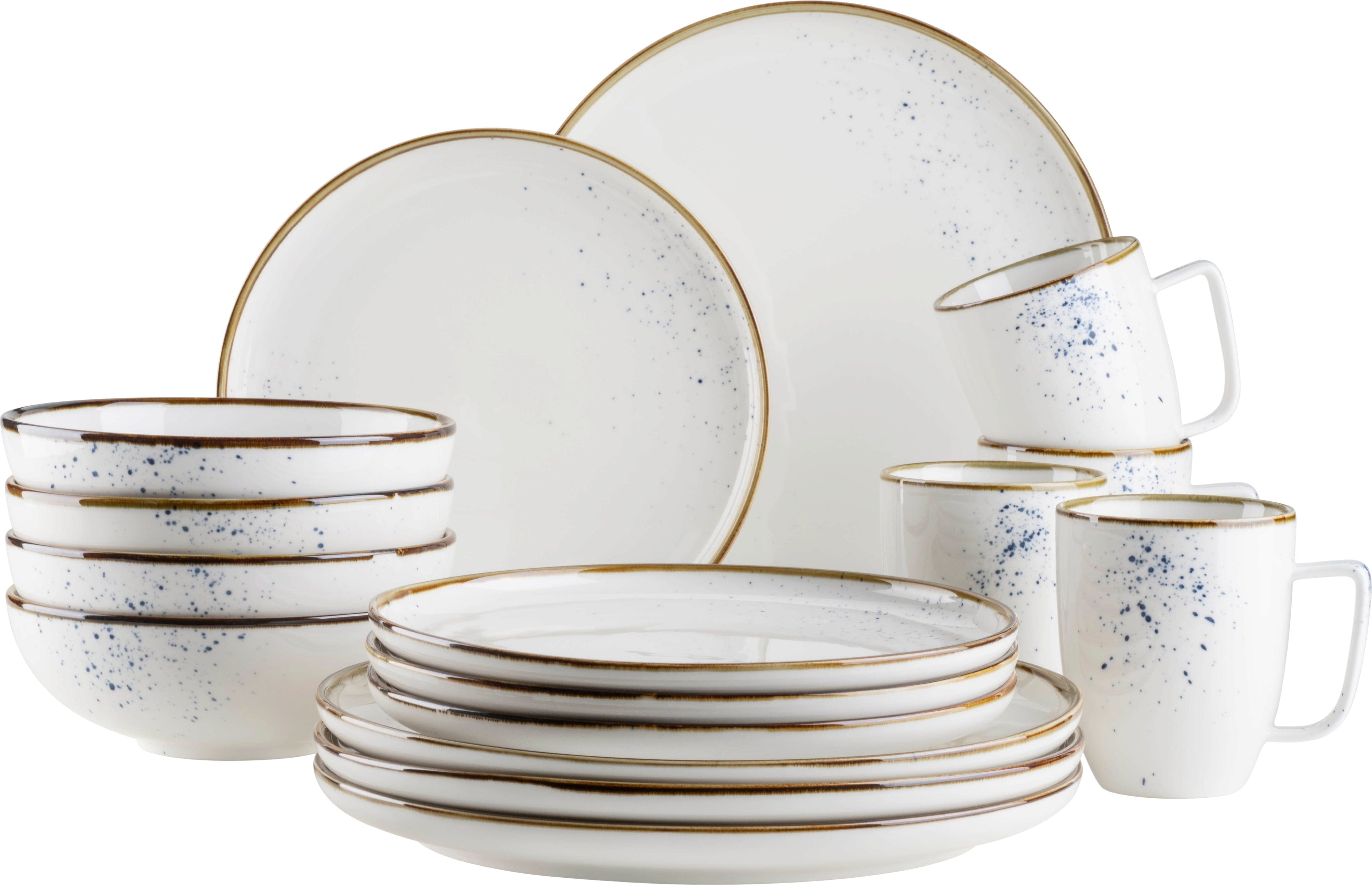 Genieße moderne Natürlichkeit mit dem 16-teiligen Kombiservice Pintar von Mäser, das durch sein harmonisches Zusammenspiel aus Weiß mit blauen Sprenkeln und einem braunen Rand besticht. Das Set für 4 Personen besteht aus vier flachen Speisetellern, vier Desserttellern, vier Schüsseln und vier Kaffeebechern.