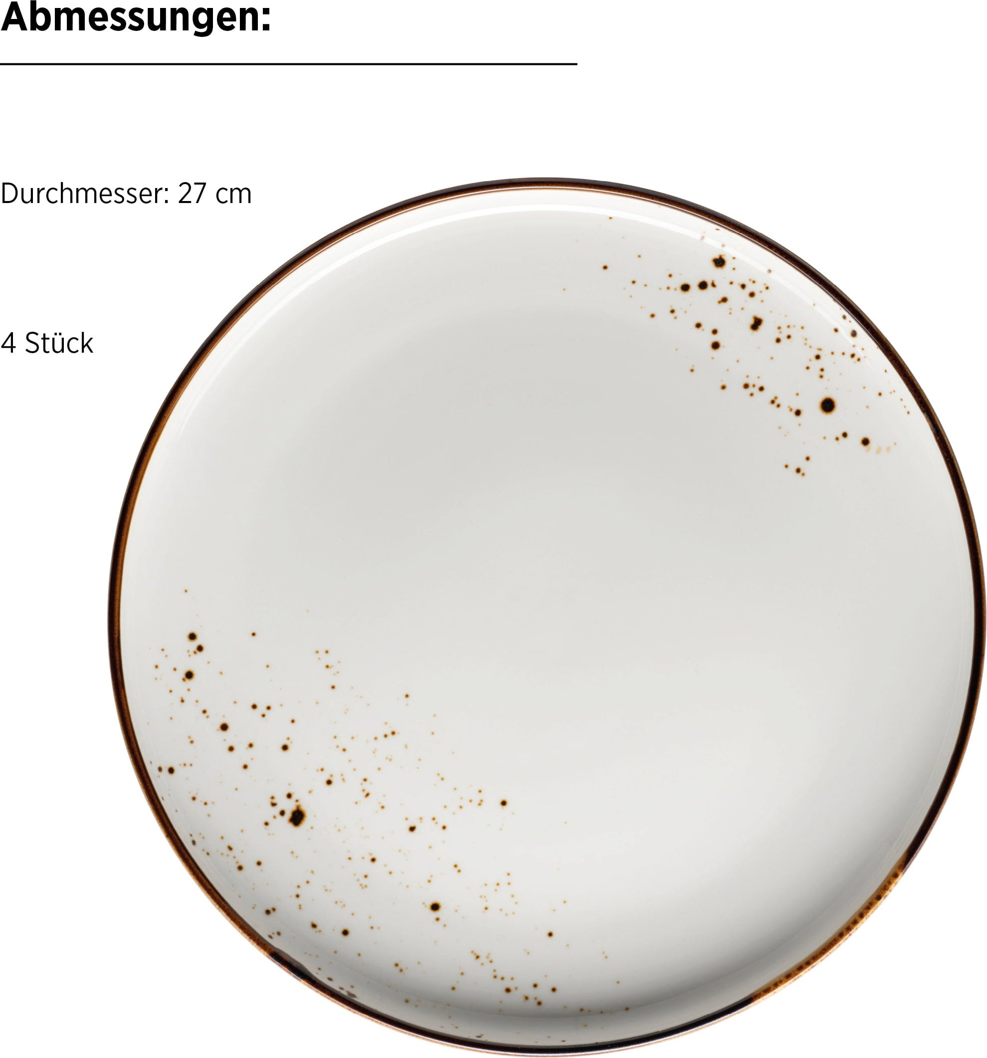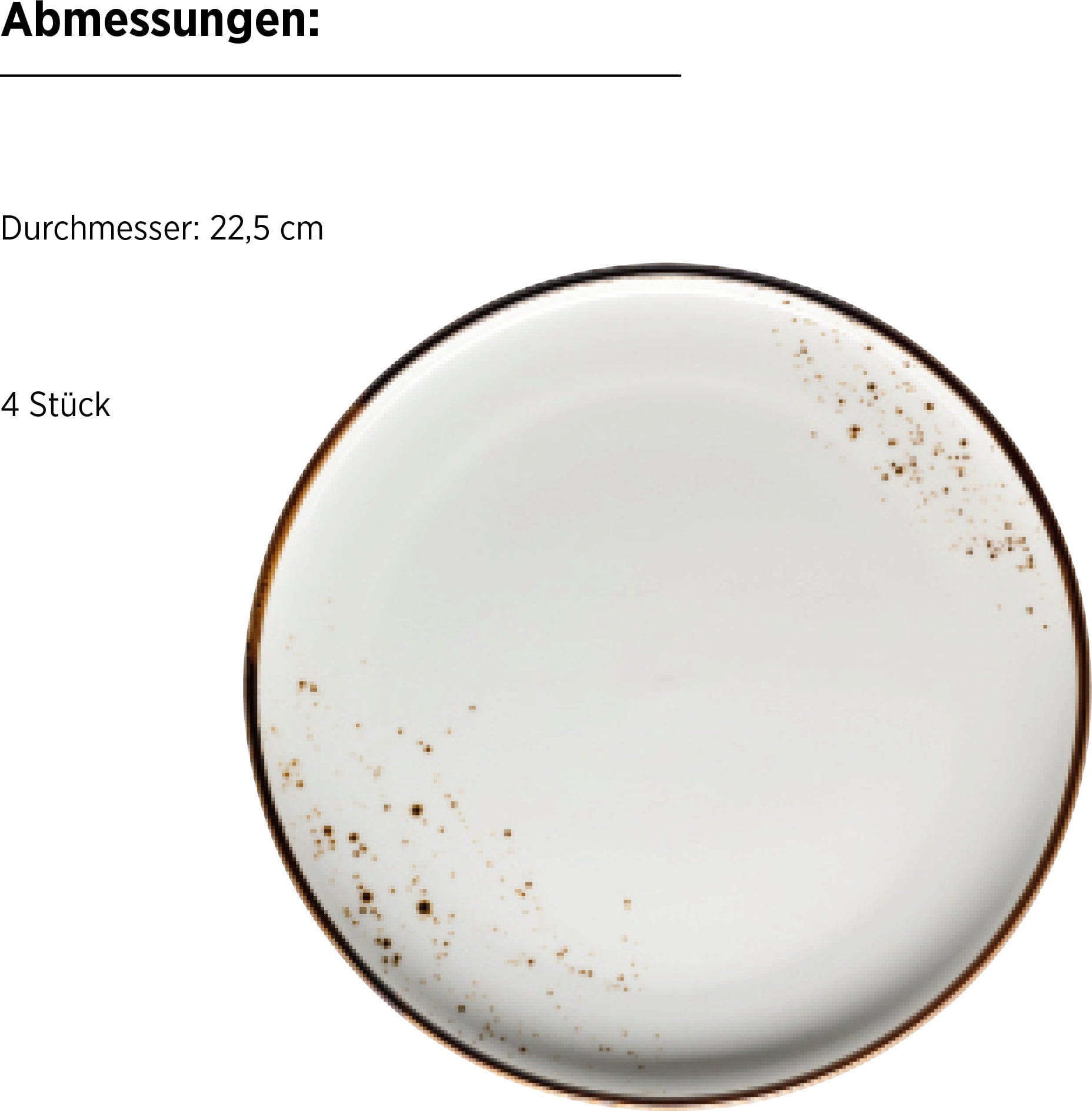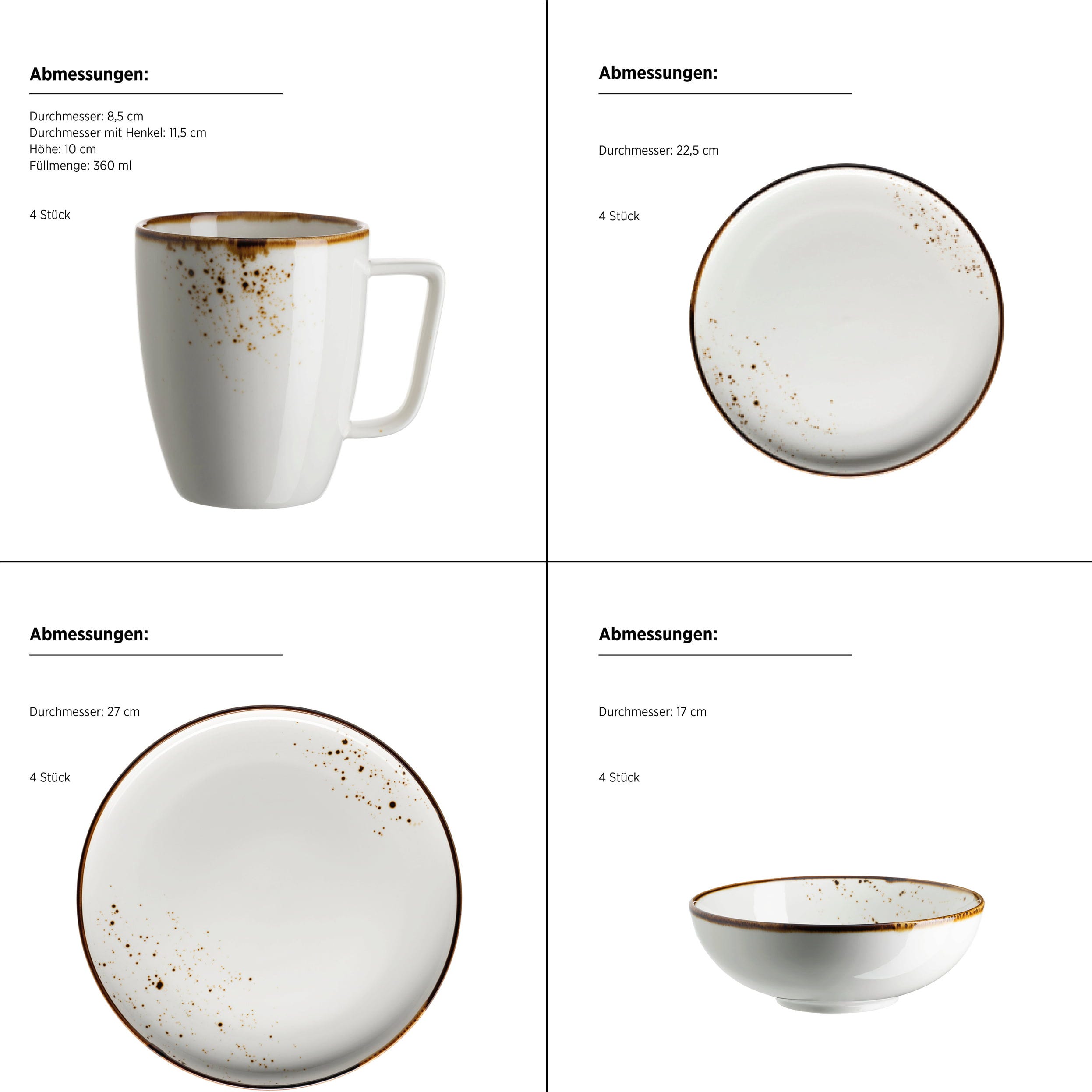 Genieße moderne Natürlichkeit mit dem 16-teiligen Kombiservice Pintar von Mäser, das durch sein harmonisches Zusammenspiel aus Weiß mit dunkleren Sprenkeln und einem braunen Rand besticht. Das Set für 4 Personen besteht aus vier flachen Speisetellern, vier Desserttellern, vier Schüsseln und vier Kaffeebechern.