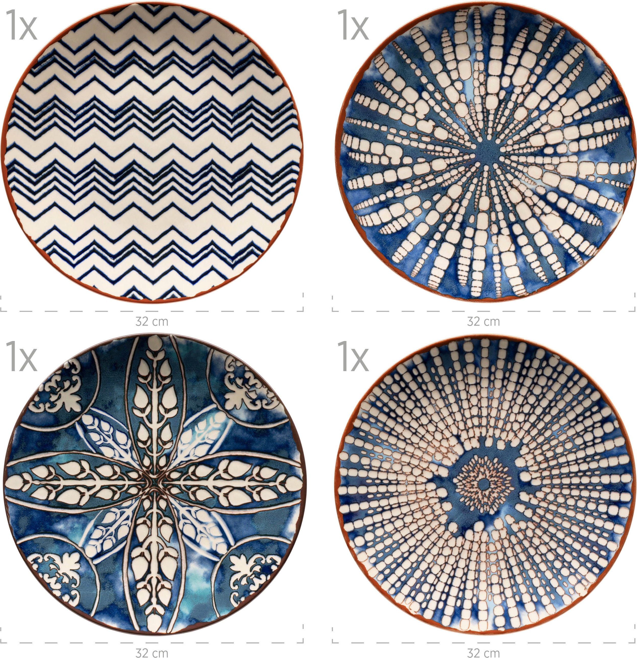 Setze ein beeindruckendes Statement auf deiner Tafel mit diesem vierteiligen Platzteller-Set der Serie Iberico Blue von Mäser, das mediterrane Lebensfreude und maurische Ästhetik perfekt vereint. Die großzügigen Teller mit einem Durchmesser von 32 cm dienen als stilvolle Basis für deine Gedecke und begeistern durch vier unterschiedliche Designs, die gemeinsam ein harmonisches Gesamtbild ergeben.