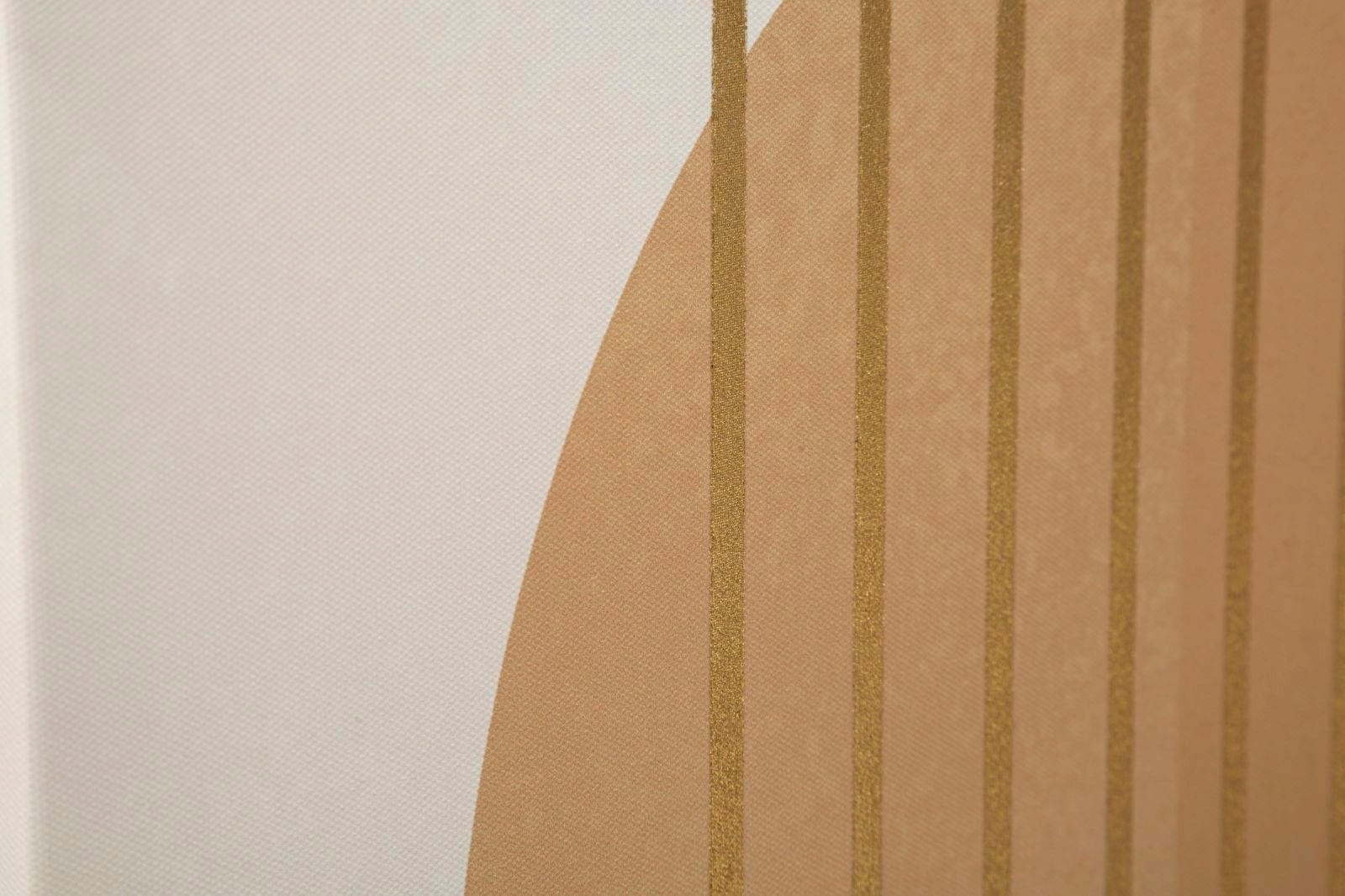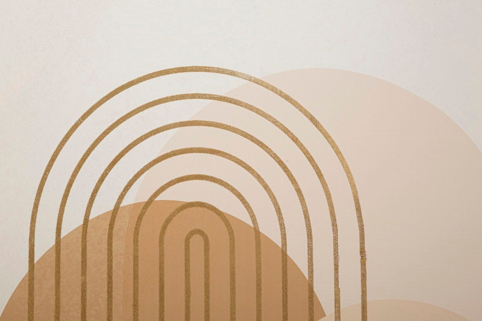 Das Motiv spielt meisterhaft mit sanften Bogenformen, die in verschiedenen Nuancen von Beige, Sand und warmem Terrakotta hintereinander gestaffelt sind. Filigrane, goldene Linien ziehen sich wie glänzende Sonnenstrahlen über die Komposition und verleihen dem Bild eine edle, strukturierte Tiefe. Aufgespannt auf einem hochwertigen Holzrahmen, ist Shine -B- die perfekte Wahl für ein stilvolles Interieur, das auf dezente Eleganz und harmonische Farbtöne setzt.