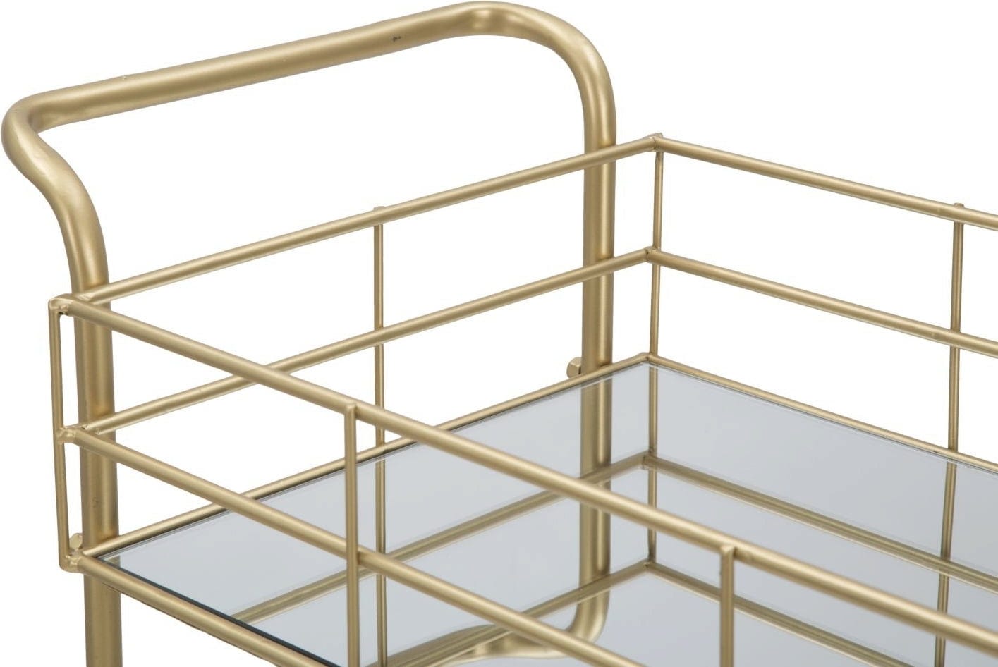 Dieser rechteckige Metallwagen ist ein unverzichtbares Accessoire für jedes glamouröse Zuhause! Das goldfarbene Gestell verleiht dem Möbelstück eine edle Ausstrahlung und macht es in jedem Ambiente zum absoluten Blickfang. Ausgestattet mit drei verspiegelten Ablagen, bietet der Wagen eine luxuriöse Bühne für Gläser, Getränke oder Dekorationsobjekte.