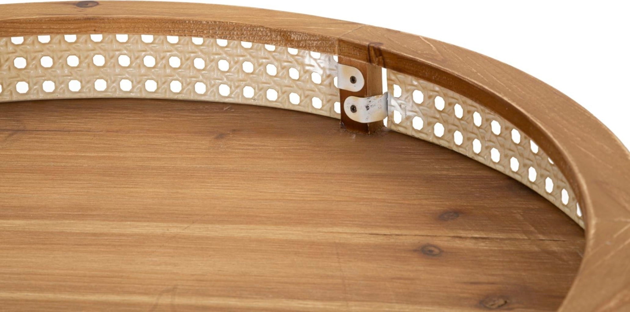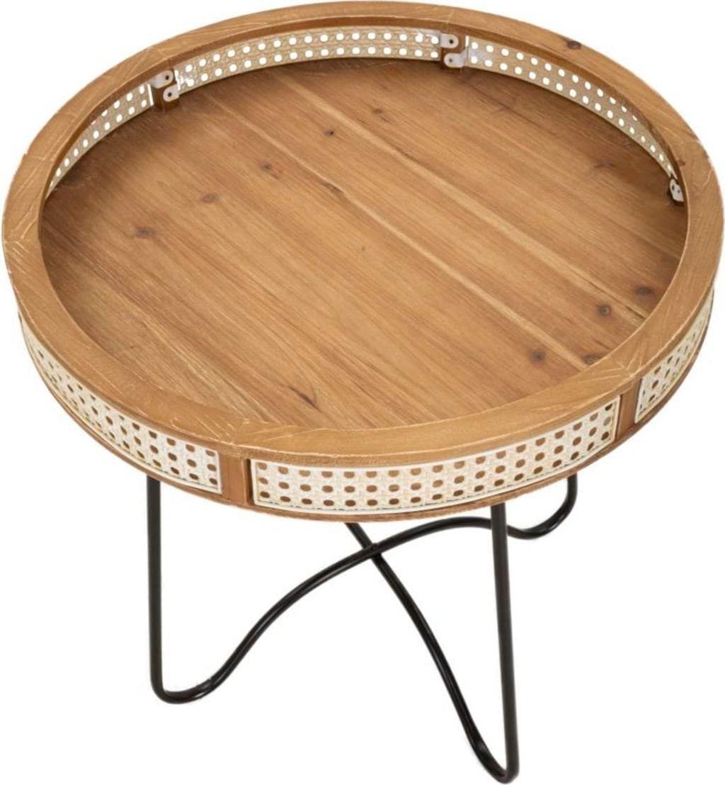Setze einen eleganten und zugleich vielseitigen Akzent in deinem Wohnzimmer mit diesem runden, niedrigen Tisch. Die besondere Materialkombination macht ihn zum idealen Begleiter für jede Art von Möbeln. Die Tischplatte ist von einem warmen Holzrand eingefasst und besticht durch den Einsatz im Wiener Stroh-Stil, der ihm eine klassische, raffinierte Textur verleiht.