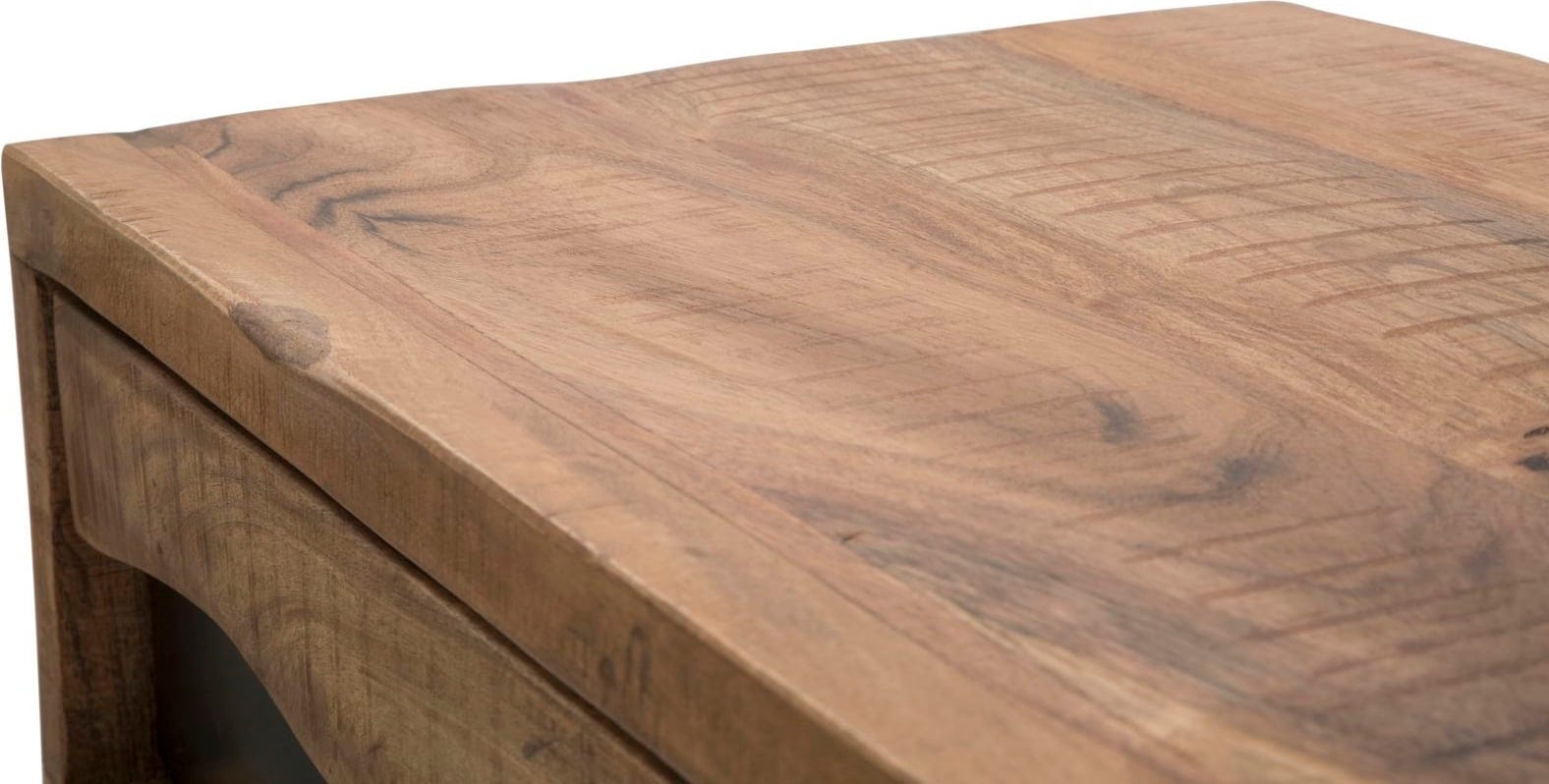 Verleihe deinem Schlaf- oder Wohnzimmer ein originelles und elegantes Design-Statement mit dieser rechteckigen TV-Konsole! Das klassische Möbelstück ist aus massivem Akazienholz gefertigt und besticht durch ein einzigartiges Detail: Die Fronten der beiden Schubladen sind mit einem besonderen Wellenmuster verziert, das der Oberfläche eine spannende, handwerkliche Textur verleiht.