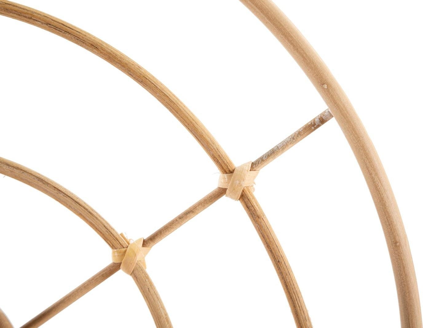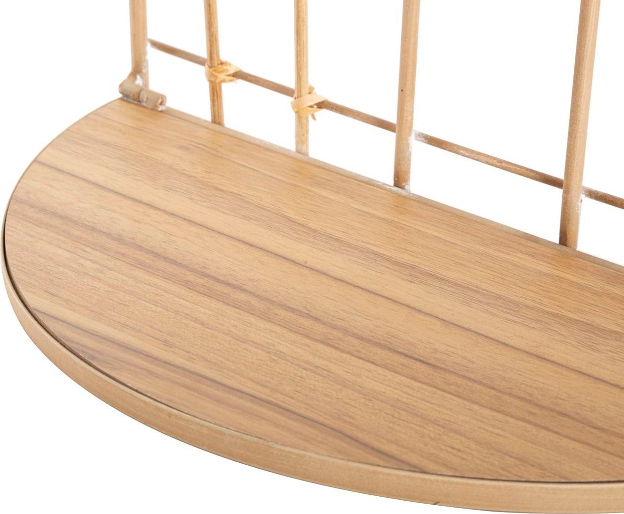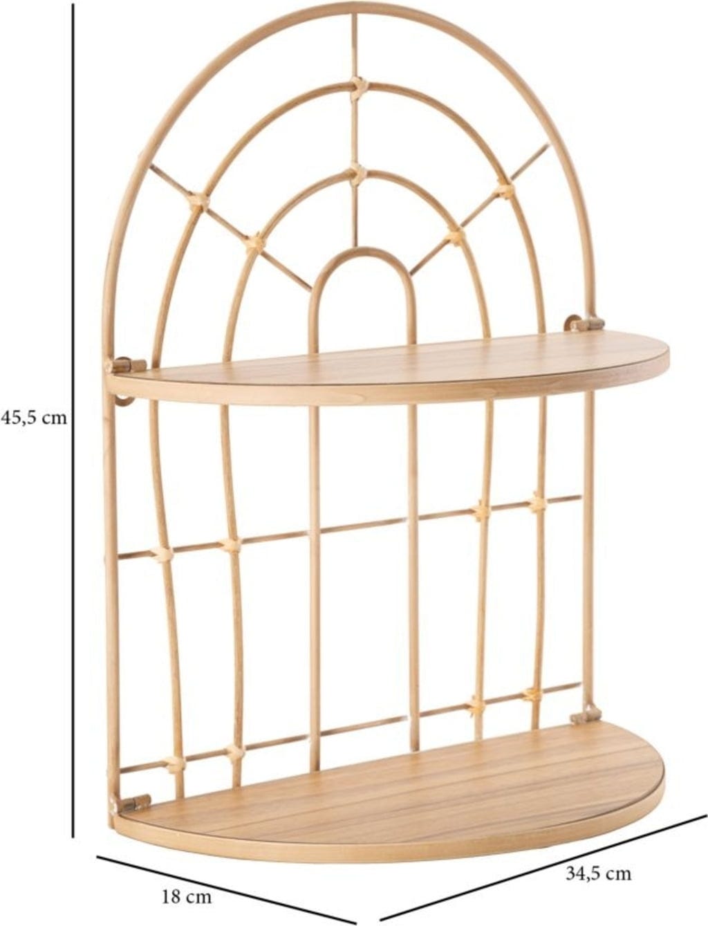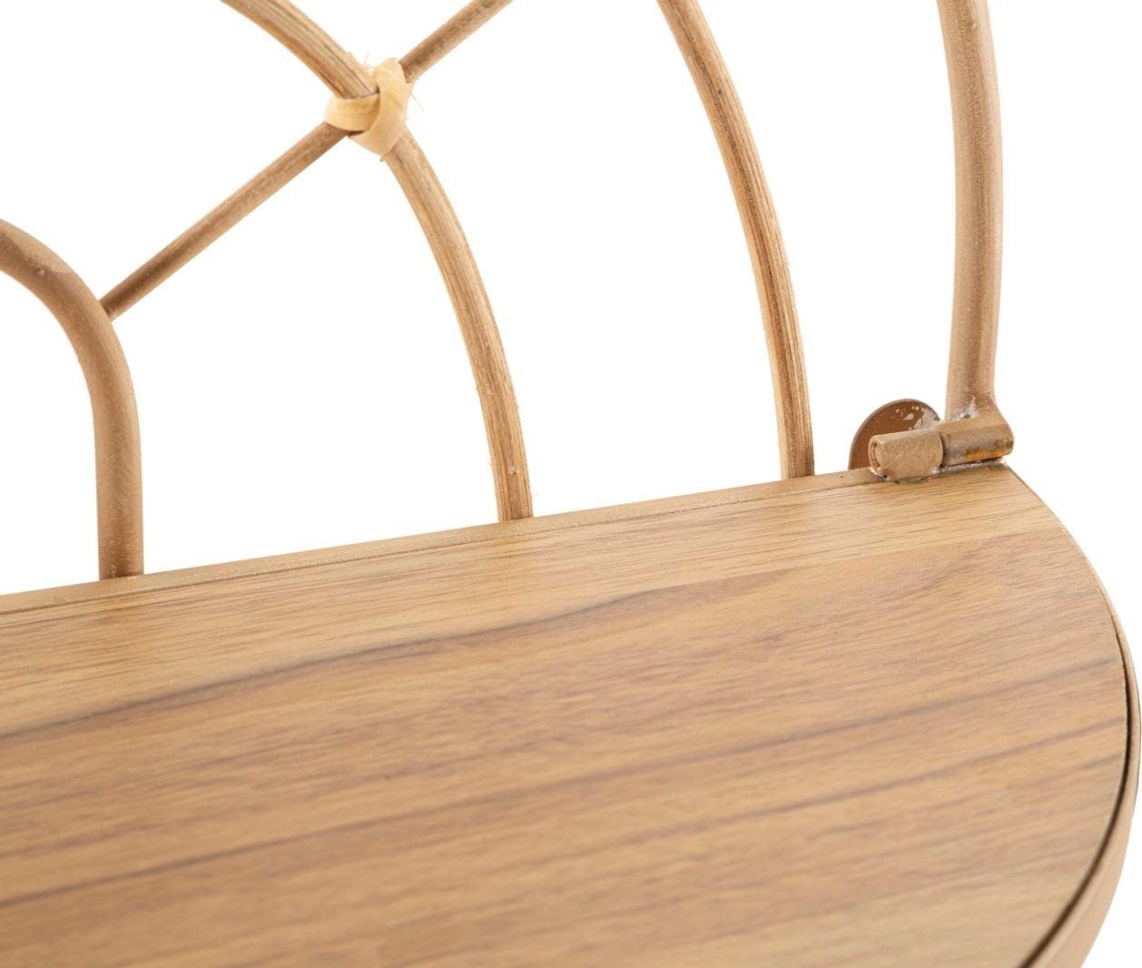 Die sanft geschwungenen Bögen und die warme Rattan-Ästhetik schaffen eine ruhige Atmosphäre, während die beiden halbrunden Ablageflächen dir genau den Platz bieten, den du für deine liebsten Deko-Schätze, kleine Pflanzen oder persönliche Erinnerungsstücke brauchst.