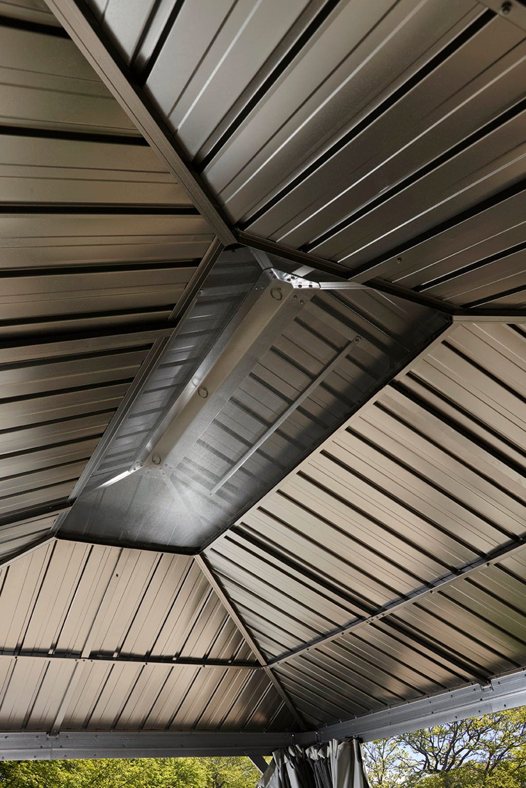 Die massive Konstruktion aus pulverbeschichtetem Aluminium mit 12 cm starken Pfosten bildet das robuste Fundament für das galvanisierte Stahldach, das Wind & Wetter zuverlässig trotzt. Das clevere doppelte Stahldach ist dabei nicht nur ein Blickfang, sondern garantiert durch den Windauslass eine stets angenehme Luftzirkulation unter deiner neuen Gartenlaube.