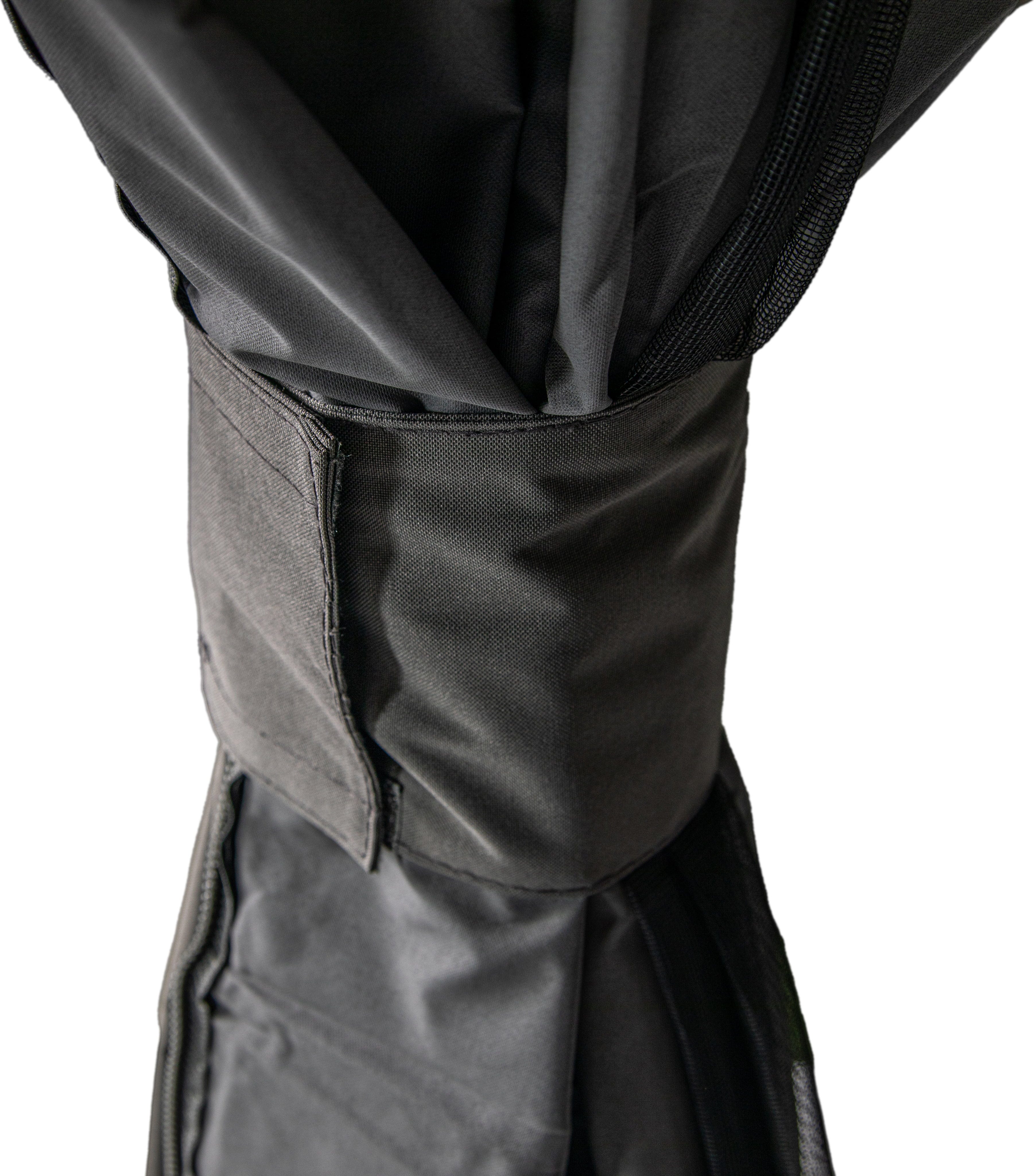 Das Set besteht aus hochwertigem 240g/m² Polyester und deckt alle Seiten deines Pavillons vollständig ab. Dank des praktischen zweigleisigen Laufschienensystems lassen sich die Vorhänge separat von den Moskitonetzen bewegen und bieten dir so maximale Flexibilität. An jeder Seite befindet sich eine Reißverschlusstür für einen bequemen Zugang.