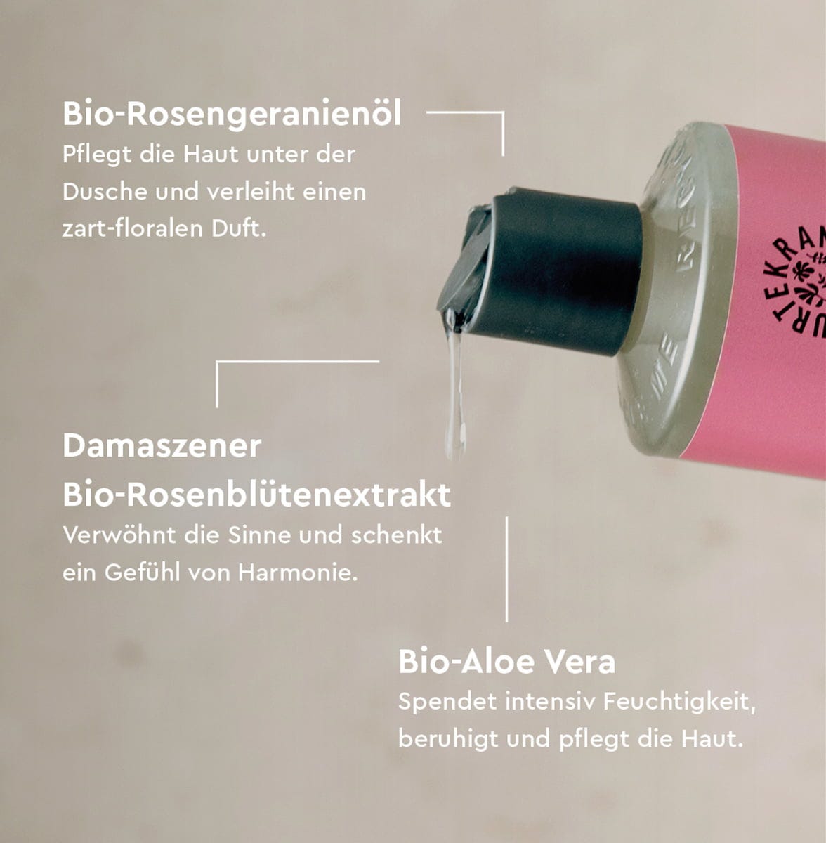 Der weiche Schaum dieses Duschgels verwöhnt die Haut und reinigt sie sanft, während Aloe Vera sowie Glyzerin für Geschmeidigkeit sorgen. Sein angenehmer Rosenduft umspielt die Sinne und verwöhnt zusätzlich.
