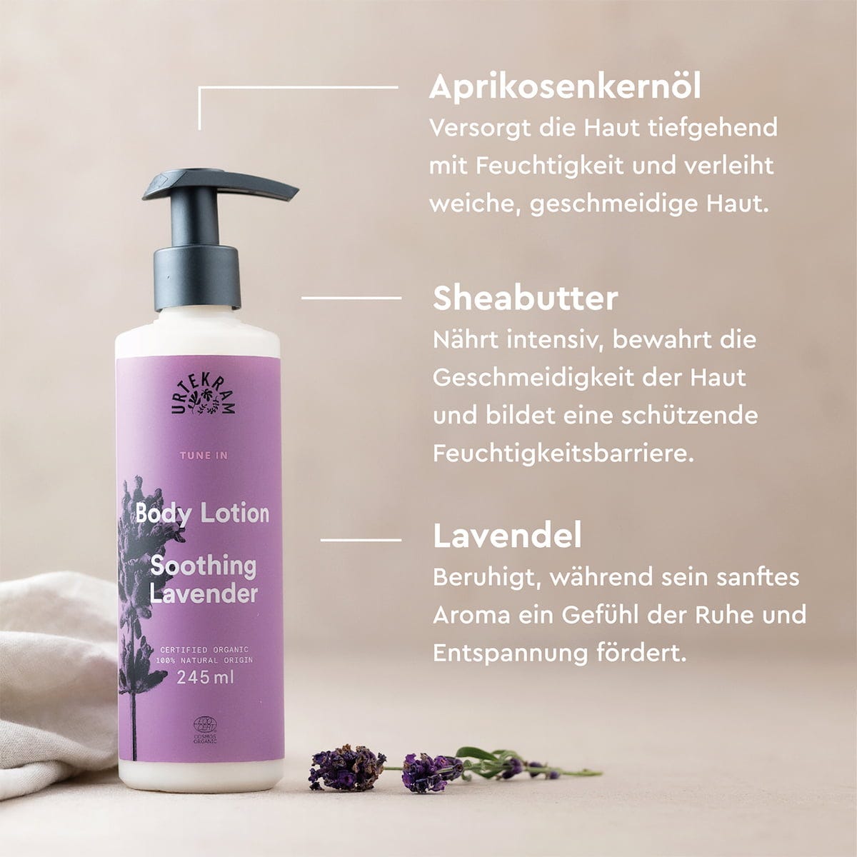 Diese Body Lotion pflegt die Haut streichelzart und weich. Reichhaltige Sheabutter sorgt in Kombination mit den Ölen aus Aprikosen, Oliven und Jojoba für anhaltende Feuchtigkeit, während der zarte Lavendelduft entspannt und beruhigt. Perfekt für ein angenehmes Hautgefühl.