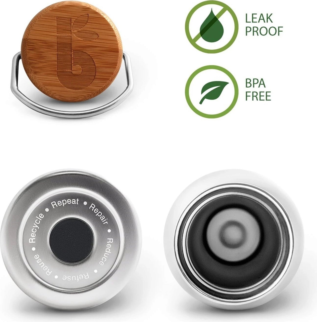• Est en acier inoxydable, absolument exempte de plastique, et élégante et intemporelle en termes de design. Elle se referme avec un bouchon en bois de bambou.