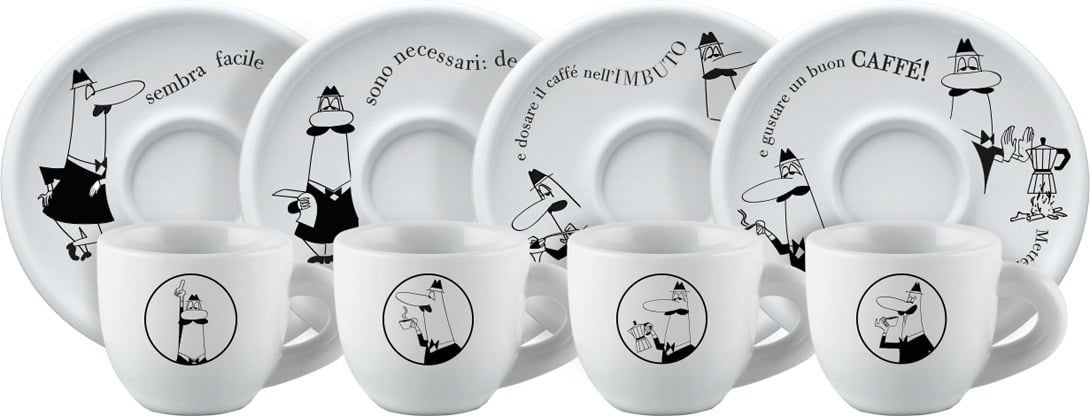 Ce set de tasses à espresso, décoré du célèbre petit homme Bialetti, met en scène les différentes étapes de la préparation du café sur les soucoupes.