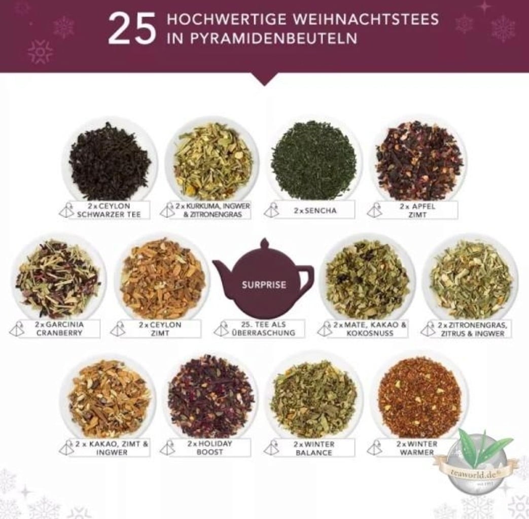 Ce calendrier de l'Avent est une belle idée cadeau pour les amateurs de thé et de tisanes. Contient 13 mélanges bio différents contenus dans 25 boîtes colorées. Chaque boîte triangulaire renferme à l'intérieur un grand sachet pyramidal, pour préparer une petite théière. Les mélanges, tous à base d'ingrédients biologiques, peuvent contenir du thé noir, vert ou blanc, ou infusions à base de fruits et d'herbes. Certaines variétés contiennent du maté ou de la réglisse.