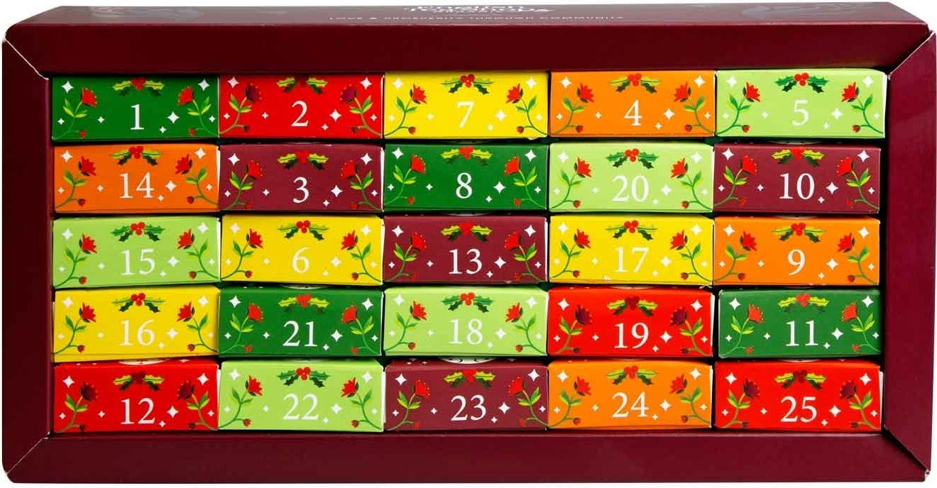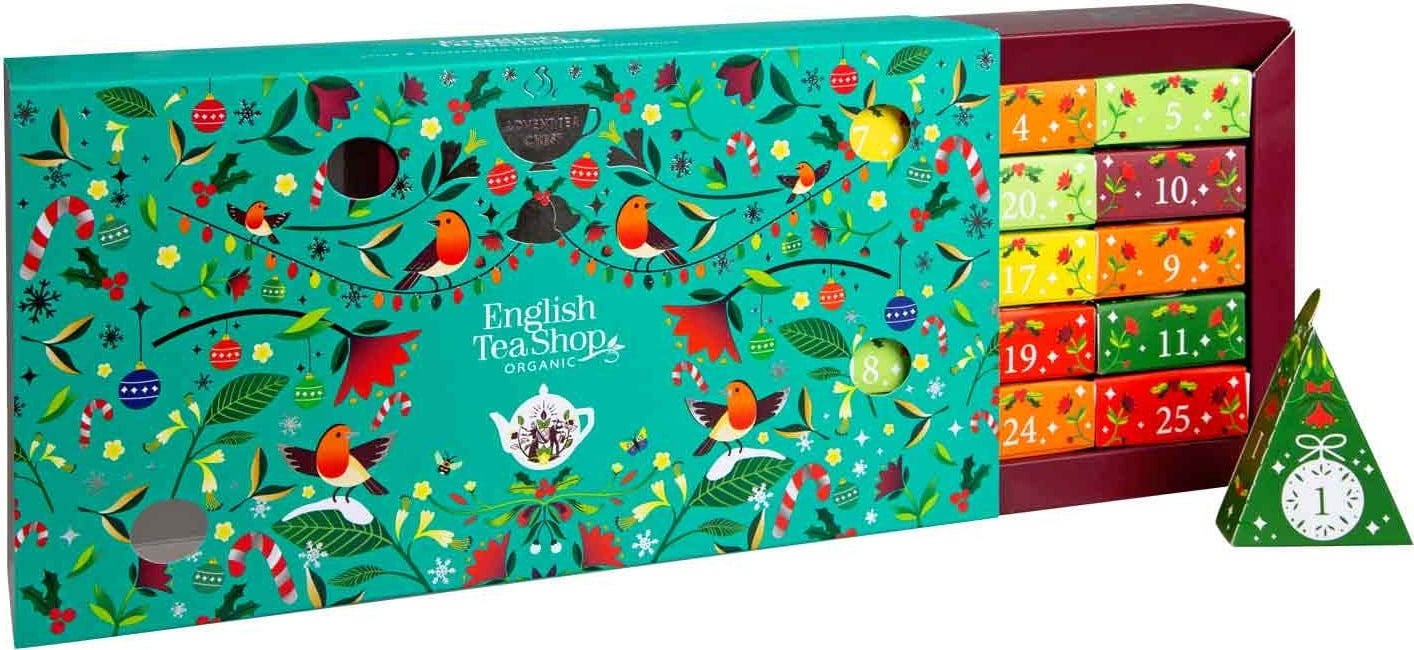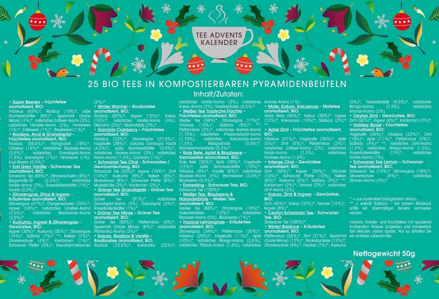 Le calendrier contient une sélection de 24 variétés différentes de thés et tisanes : du thé noir au thé vert, des tisanes de plantes aux infusions fruitées, sans oublier les thés aux épices ou encore le maté. Tous les mélanges sont fabriqués à partir d'ingrédients biologiques de haute qualité et certains contiennent également de la caféine ou de la réglisse. Chaque sachet pyramidal permet de préparer une petite théière.