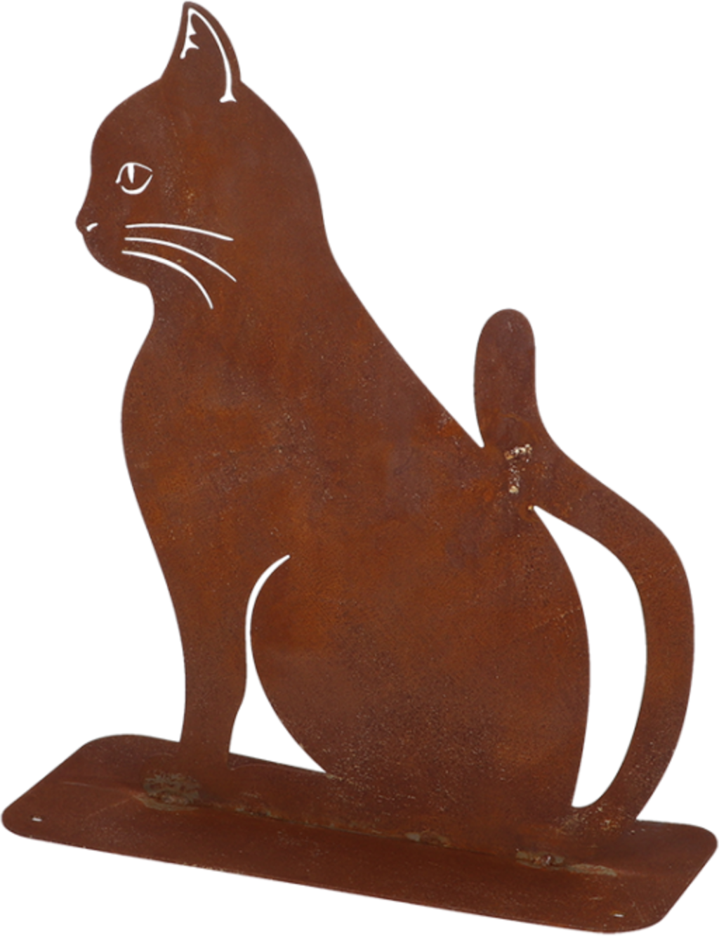 Cette figurine de jardin découpée au laser représente un chat assis dans une élégante finition rouille. Sa surface développe au fil du temps une patine naturelle qui lui donne un charme rustique authentique. Grâce à sa base plate, elle se place facilement dans les massifs, pots ou terrasses.