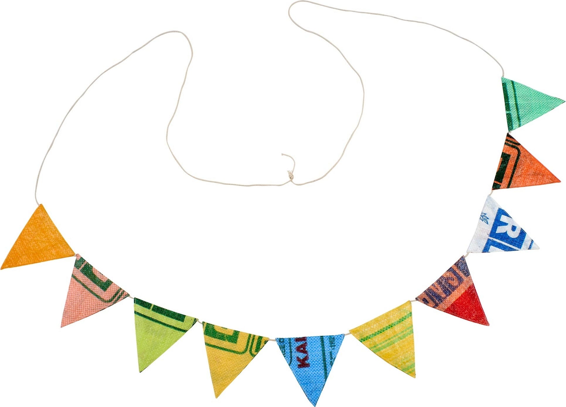 Transformez votre espace extérieur en un lieu plein de vie tout en misant sur un artisanat authentique et chargé de caractère ! Cette guirlande unique en son genre apporte instantanément une ambiance festive à votre prochaine fête dans le jardin grâce à ses couleurs éclatantes, et résiste sans problème à une petite averse grâce à son matériau recyclé robuste. Chaque triangle de fanion raconte sa propre histoire : ils sont fabriqués à la main à partir de sacs de riz usagés au Sri Lanka. Vous tenez ainsi entre vos mains une pièce véritablement unique.
