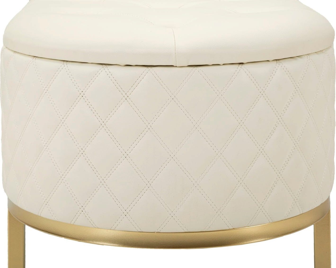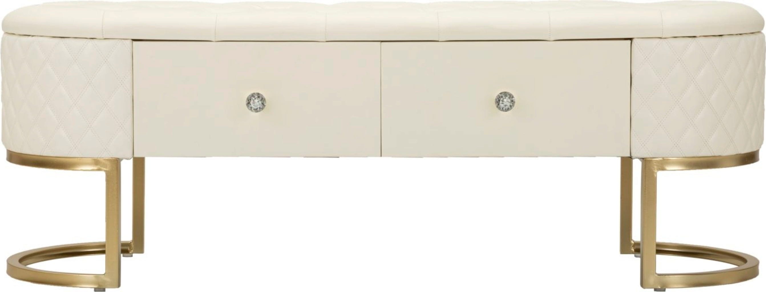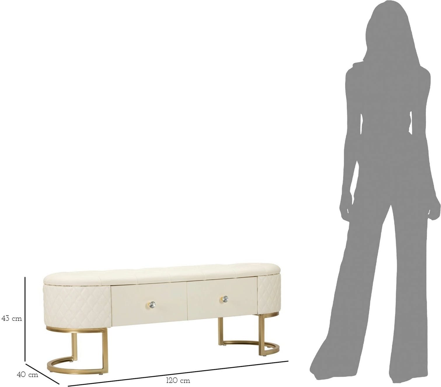 Combinez confort et design extravagant dans votre maison grâce à ce banc élégant et fonctionnel ! Il se distingue par sa forme allongée distinctive, recouverte de similicuir luxueux de couleur crème et rehaussée d'un fin capitonnage en losanges. Le rembourrage moelleux offre une assise confortable, tandis que les deux tiroirs intégrés offrent un espace de rangement étonnamment généreux pour des plaids ou d'autres objets.