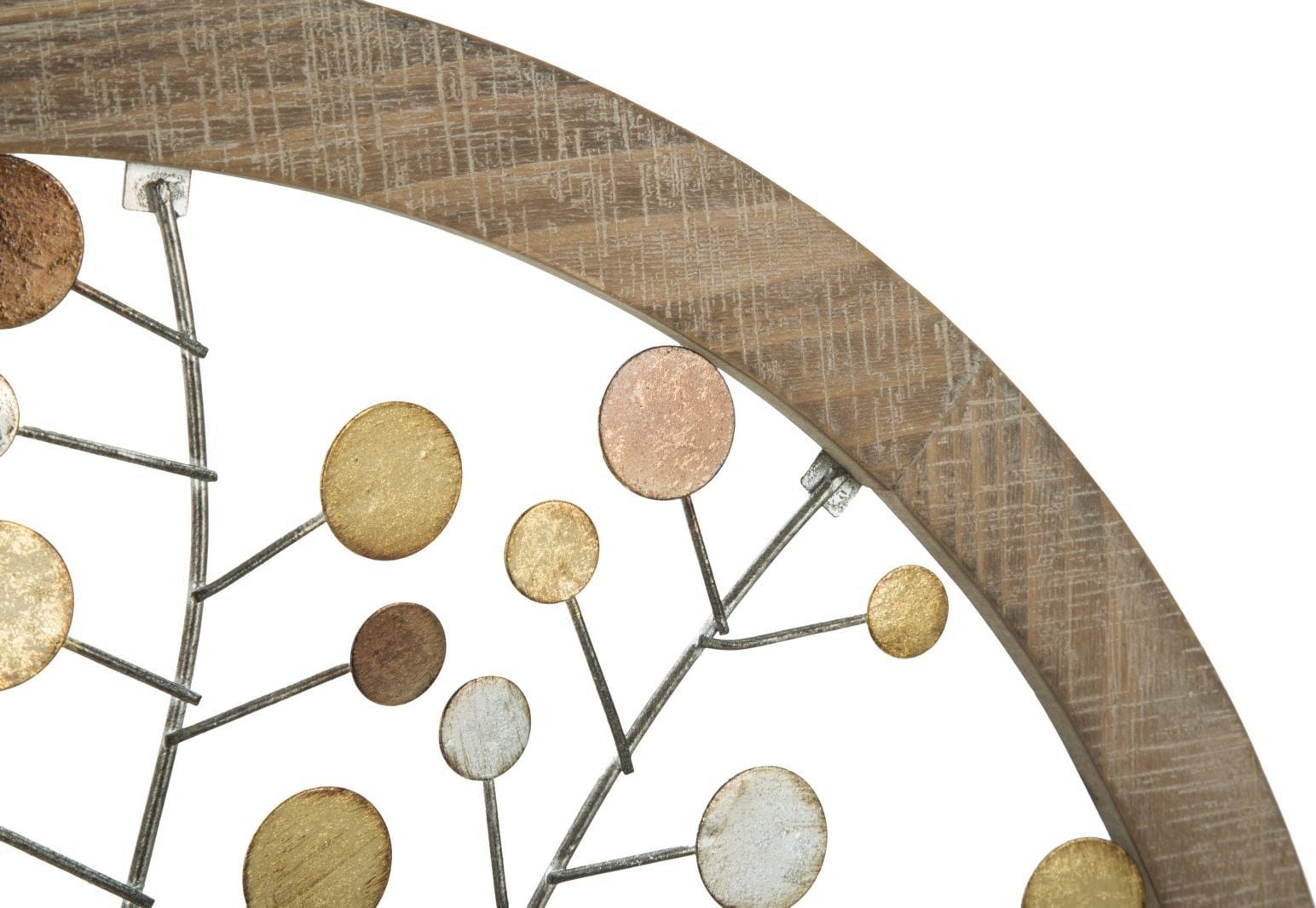 Une œuvre harmonieuse dans votre intérieur avec la décoration murale Arbre de Vie de Mauro Ferretti. Ce panneau 3D rond associe un cadre en bois au style rustique à une silhouette d’arbre en métal, finement travaillée. Les branches sont décorées de feuilles circulaires, déclinées en plusieurs tons métalliques, comme l’or, le cuivre et l’argent, ce qui donne à l’ensemble une touche de glamour moderne.