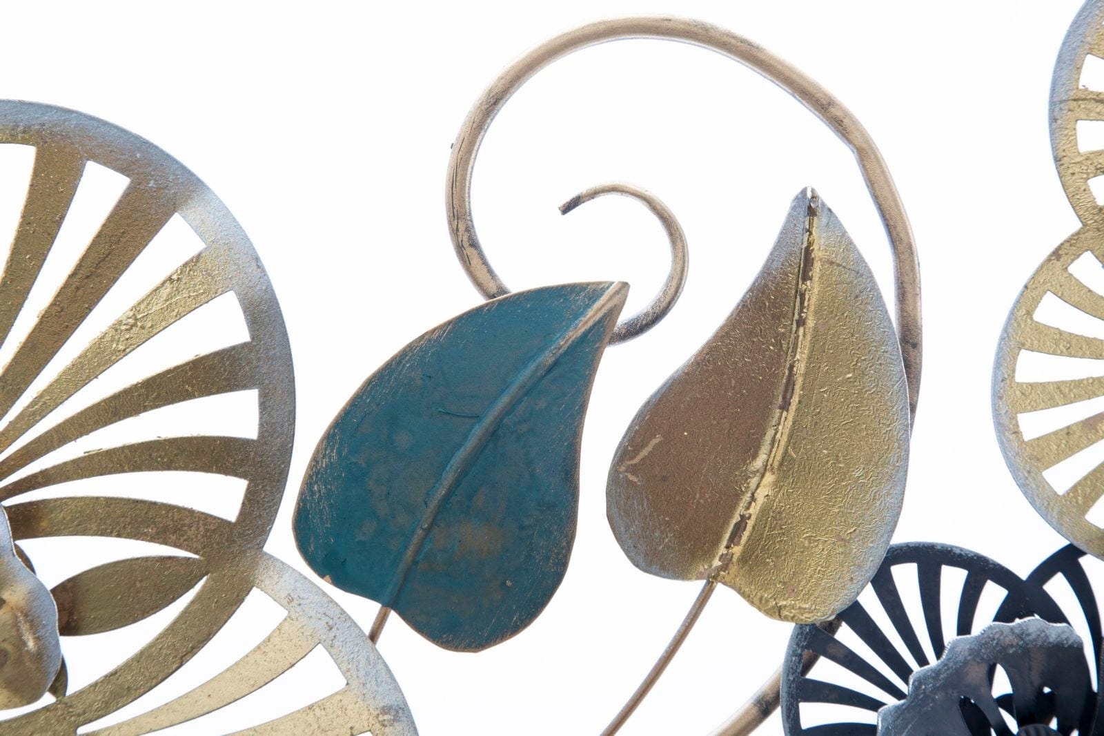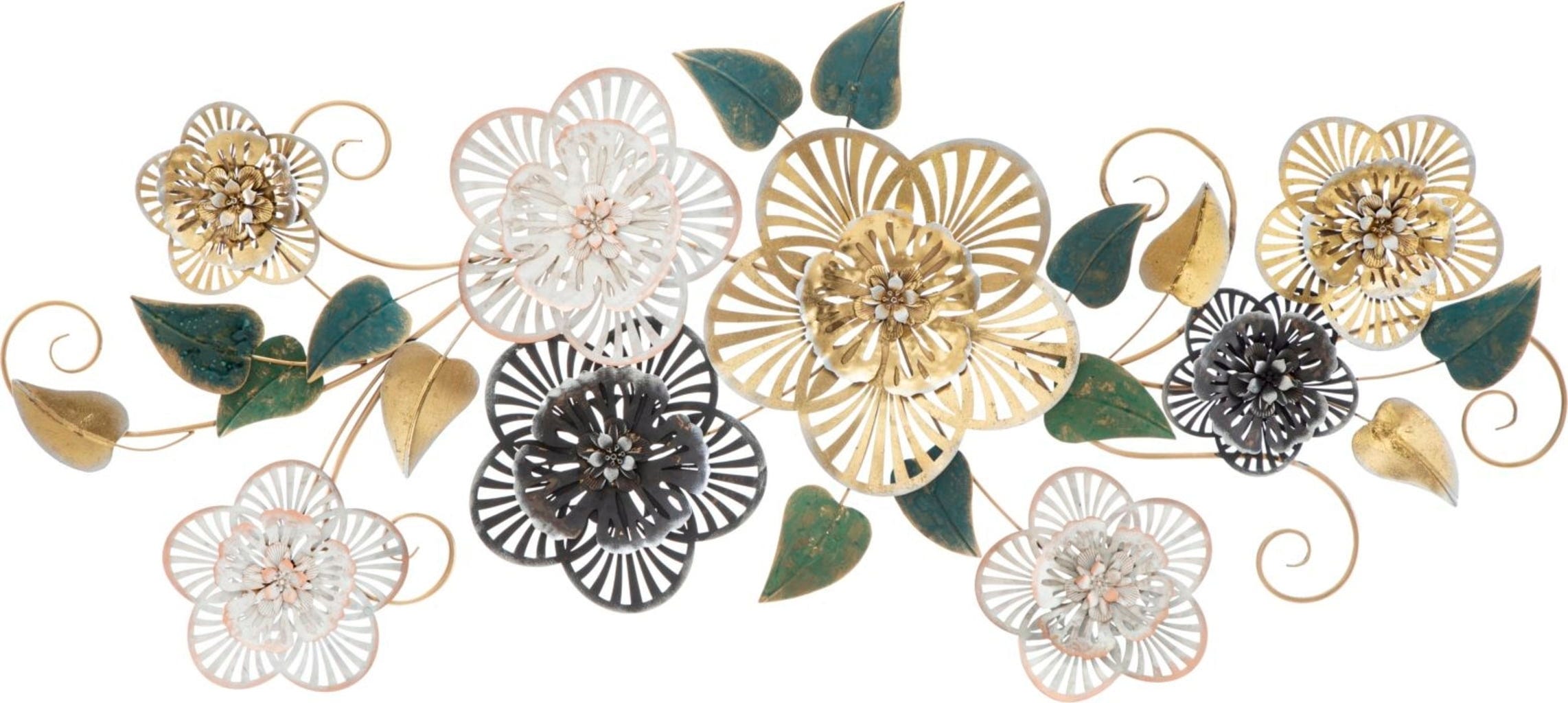 Ajoutez une note éclatante avec la décoration murale Campur -B- de Mauro Ferretti. Ce vaste panneau 3D en métal capture la beauté d’un jardin en fleurs et la transforme en une œuvre murale luxueuse. Le design se distingue par des fleurs finement travaillées, en éventail, dans des tons d’or, de crème et de nuances sombres, harmonieusement complétées par des feuilles vert émeraude à l’aspect antique.