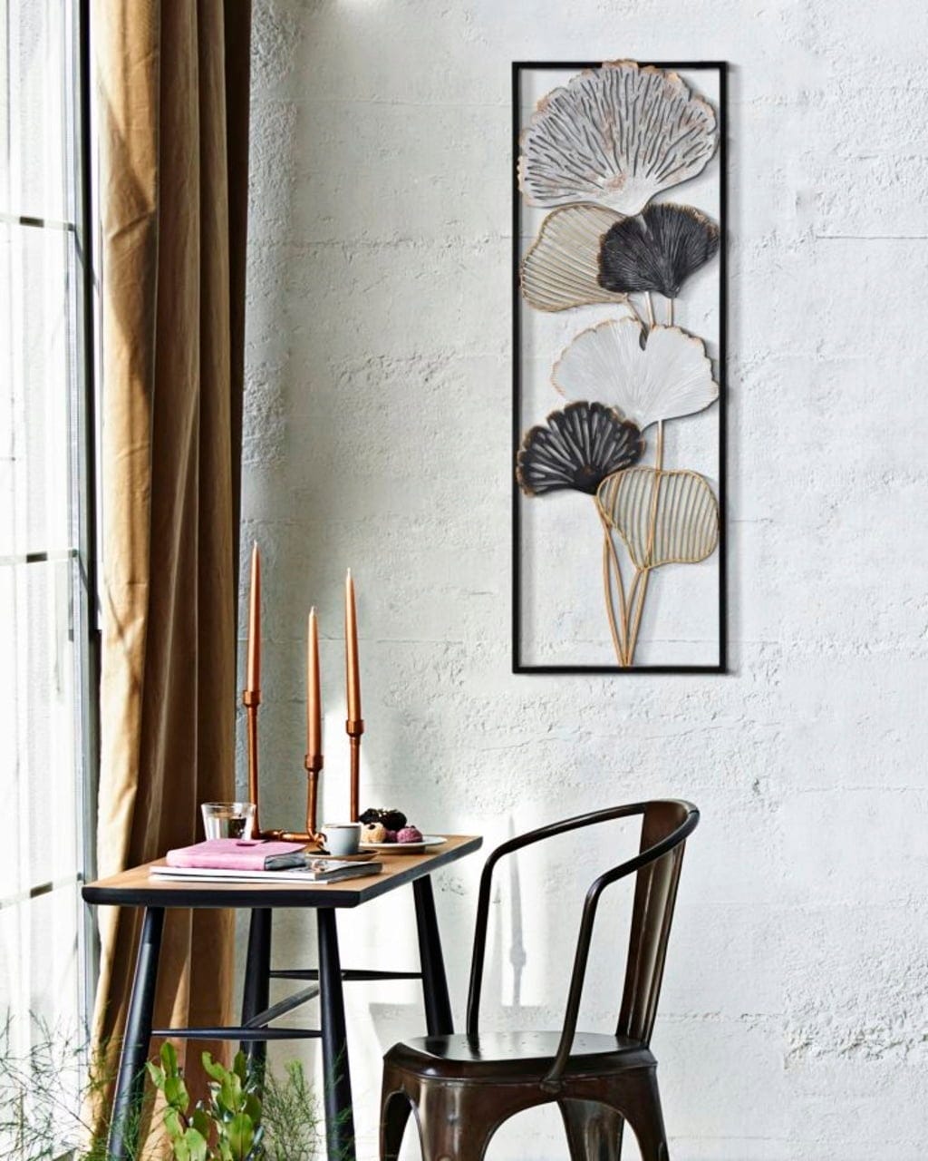 Donnez à vos murs une personnalité affirmée avec la décoration murale Ory -B- de Mauro Ferretti. Ce panneau en métal impressionnant met en valeur la tendance des décors muraux 3D et installe chez vous une ambiance artistique, riche en caractère. Le design séduit par ses motifs de ginkgo en éventail, déclinés dans un équilibre raffiné de blanc élégant, de noir profond et d’or luxueux.