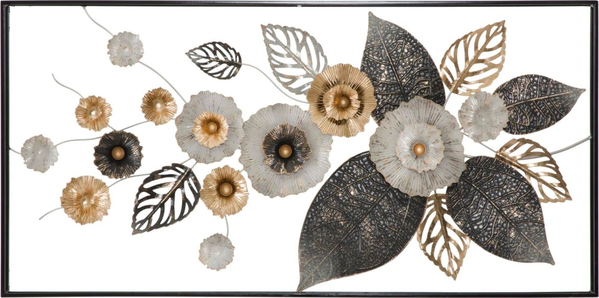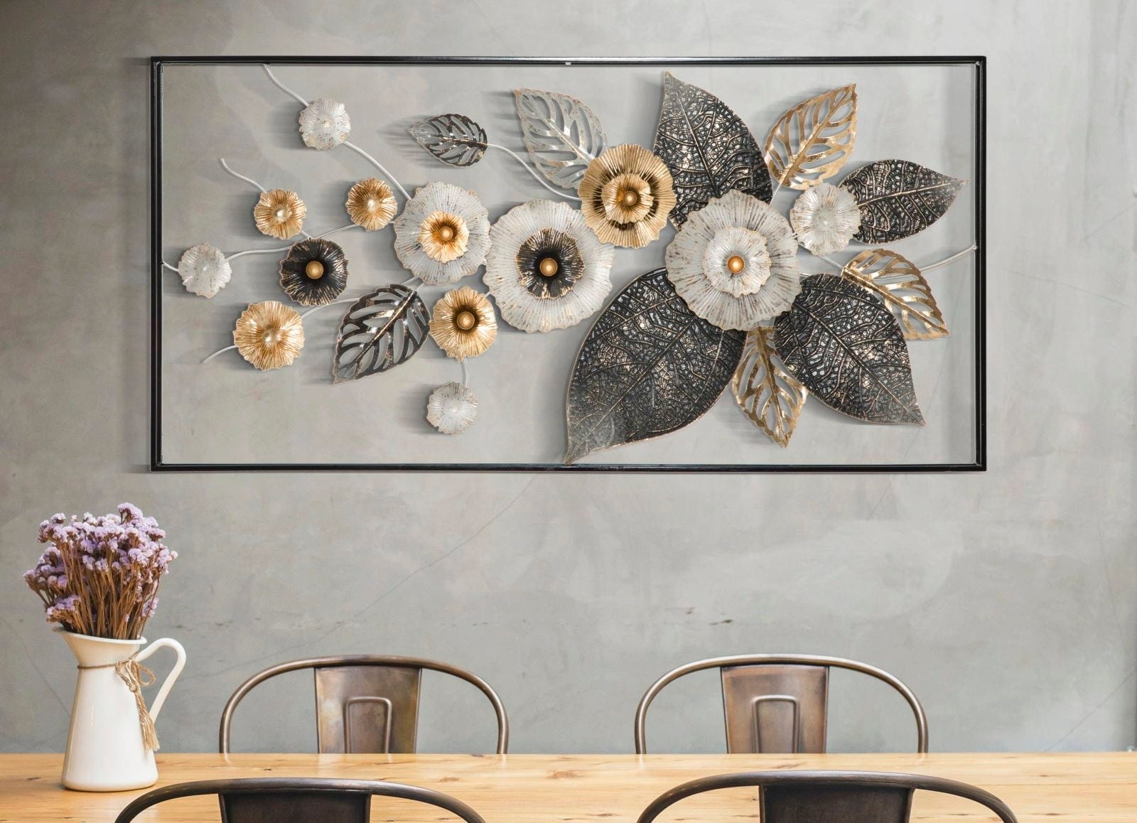 Le contraste entre les nervures finement dessinées et les têtes de fleurs travaillées en volume crée une profondeur impressionnante, rehaussée d’une touche de glamour. Encadrée par un cadre noir sobre, cette pièce est une décoration luxueuse au-dessus du canapé ou d’un buffet.