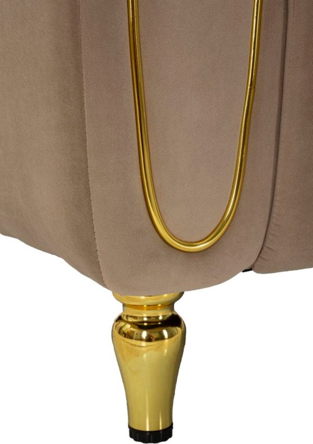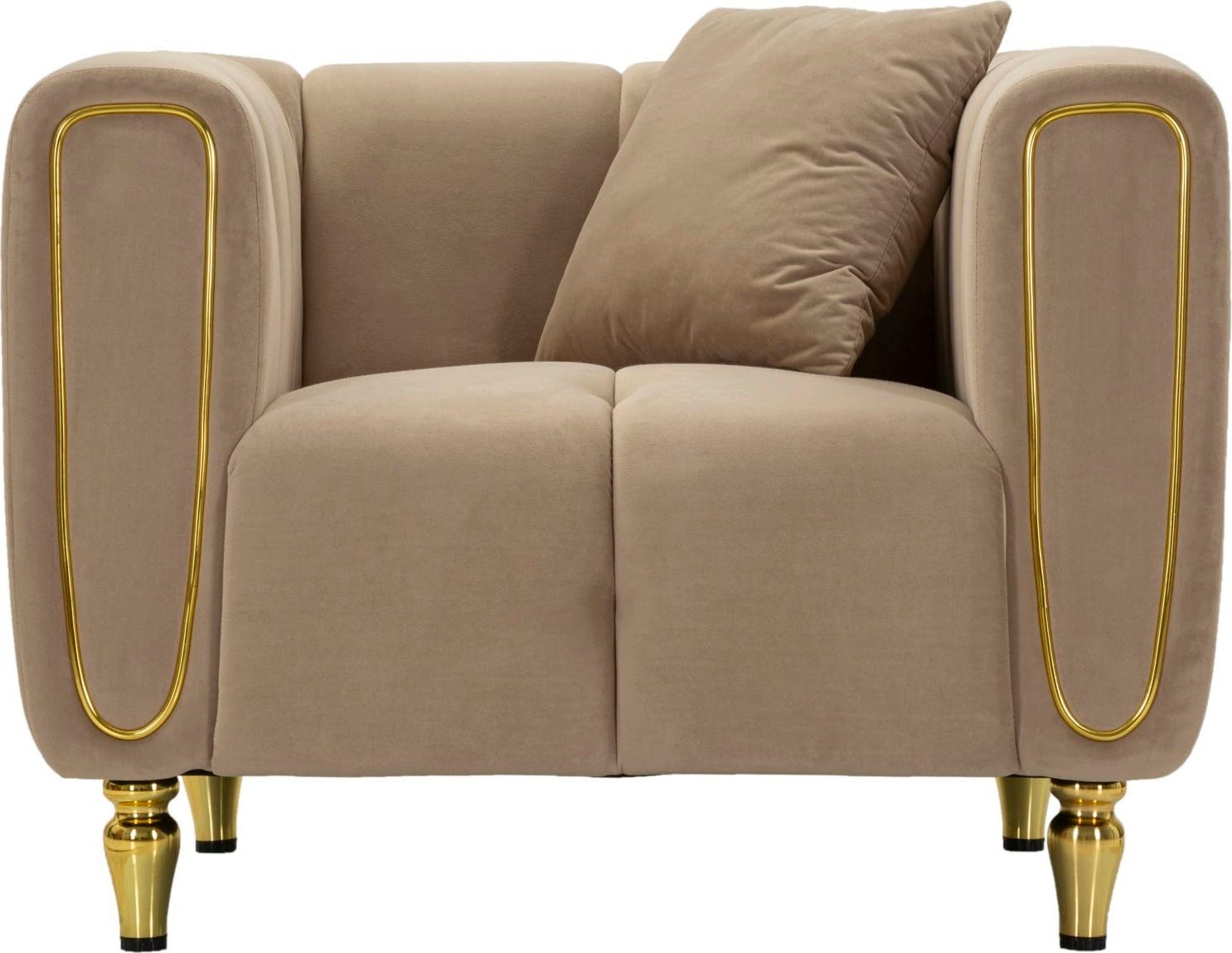 Les accoudoirs incurvés sont élégamment mis en valeur par des accents dorés brillants. Le fauteuil repose sur de courtes pieds ronds dorés, qui soulignent parfaitement son look moderne et luxueux. Ce fauteuil promet un confort optimal et est le complément idéal pour les intérieurs modernes et élégants qui privilégient le style et le bien-être.