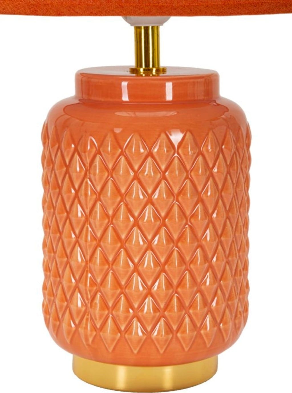 Ajoutez une touche de couleur audacieuse et un design moderne à votre chambre à coucher avec cette impressionnante lampe de chevet. La base cylindrique de la lampe, d'un orange vif, est ornée d'un élégant motif en losanges en relief, qui confère à la surface une texture luxueuse et agréable au toucher. Ce design saisissant est élégamment souligné par une base dorée brillante et des détails dorés sur le col de la lampe.