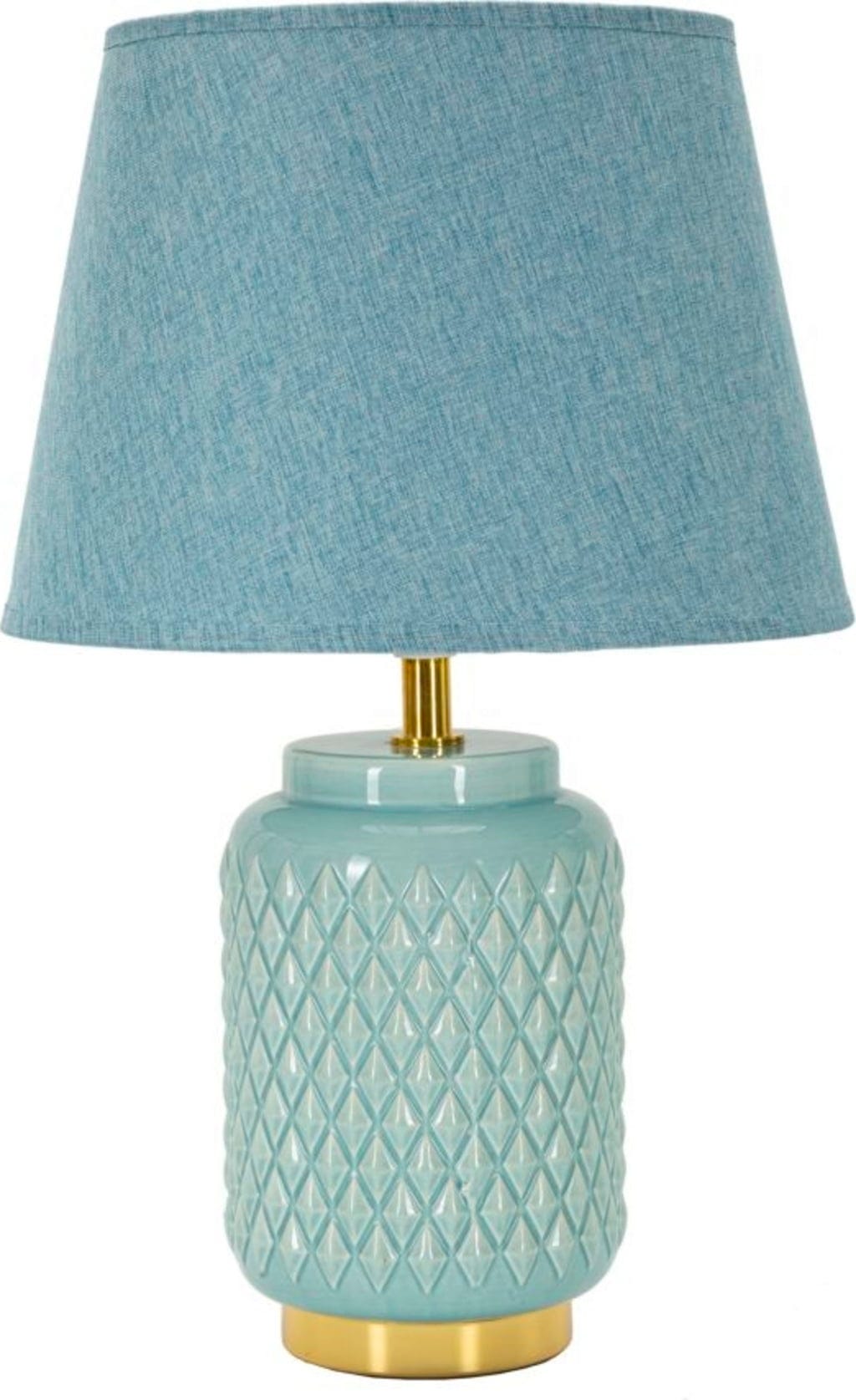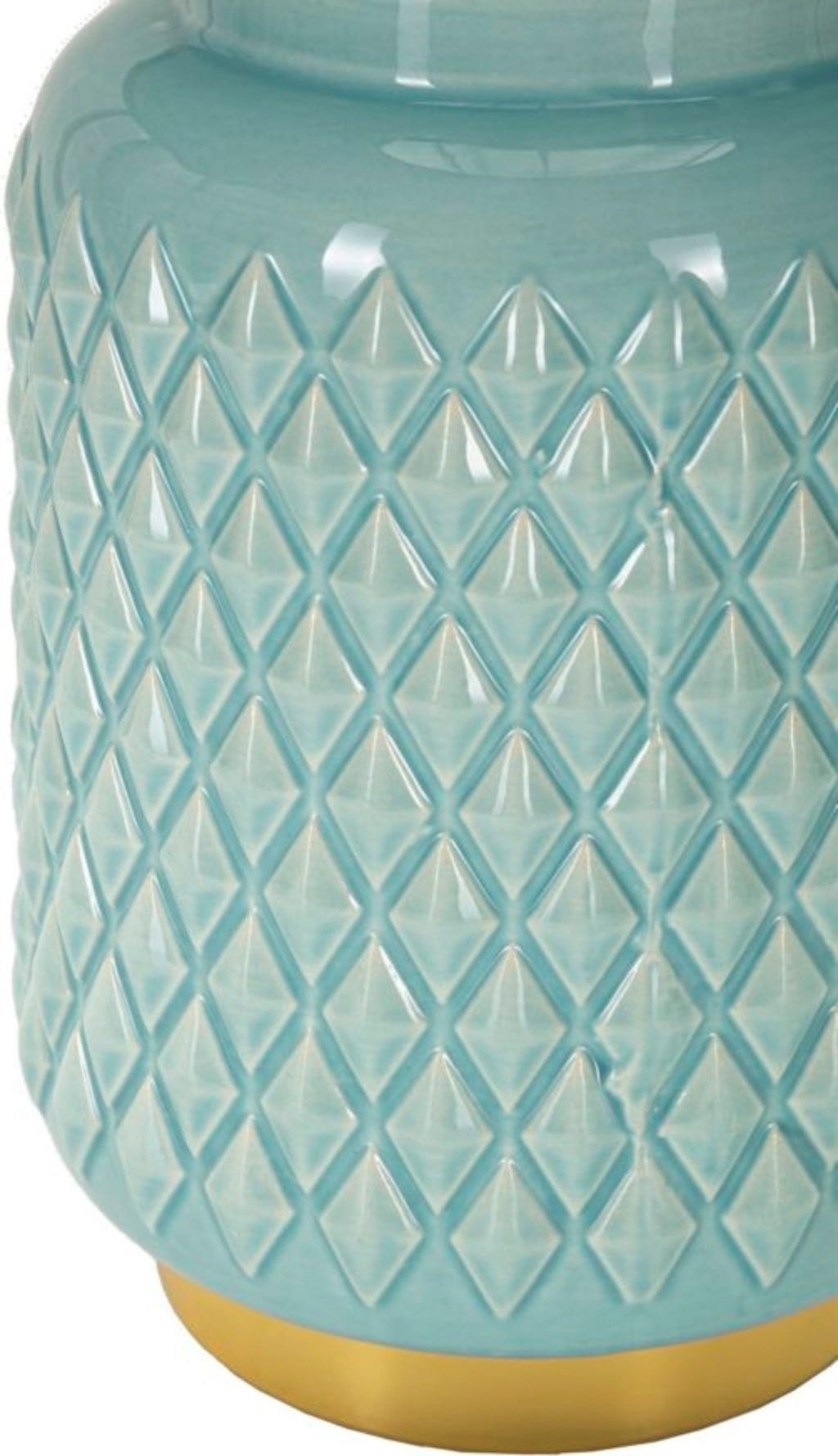 Apportez une touche de couleur audacieuse et un design moderne à votre chambre à coucher avec cette impressionnante lampe de chevet. La base cylindrique de la lampe, d'un turquoise frais, est ornée d'un élégant relief en losanges en creux, qui confère à la surface une texture luxueuse et agréable au toucher. Ce design saisissant est élégamment souligné par une base dorée brillante et des détails dorés sur le col de la lampe.