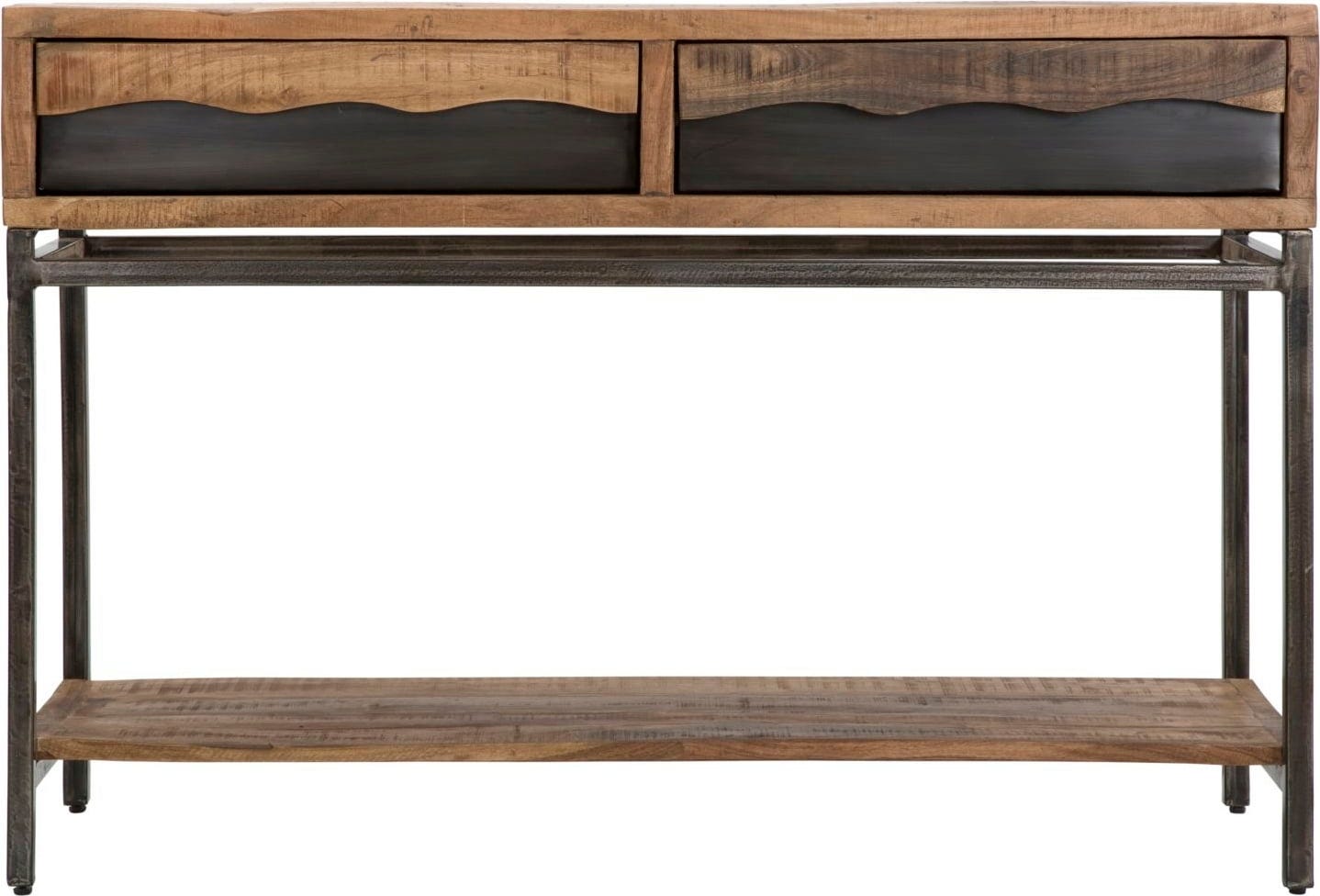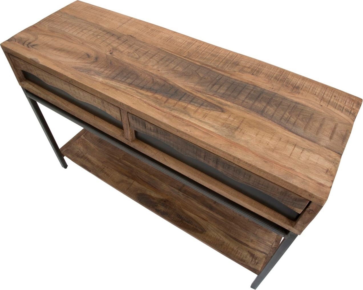 Grâce aux deux tiroirs et à l'étagère inférieure, la console offre un espace de rangement polyvalent. La structure simple en métal noir crée un contraste élégant avec le bois chaleureux et assure la stabilité nécessaire. Cette pièce est le complément idéal pour les amateurs de matériaux de qualité et de designs expressifs !