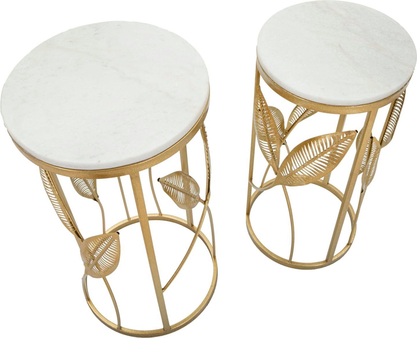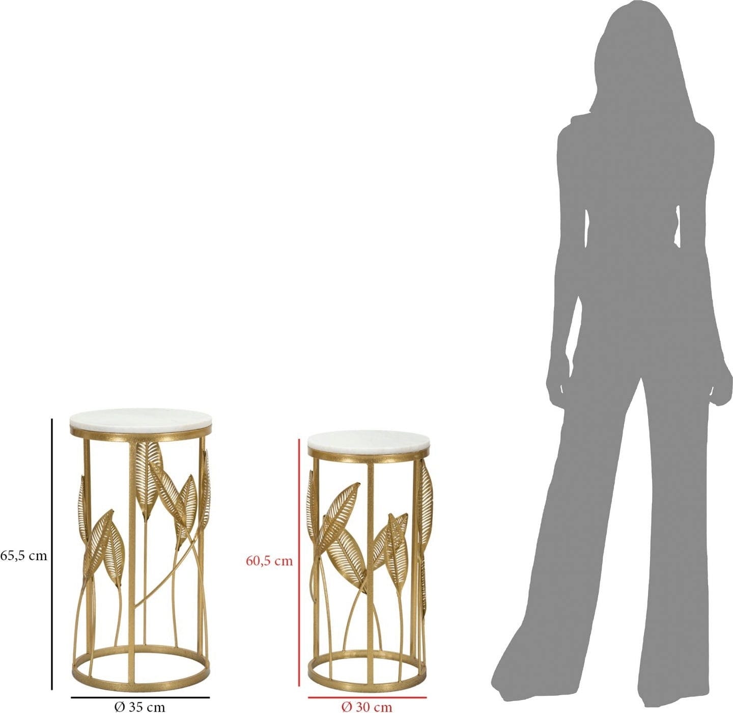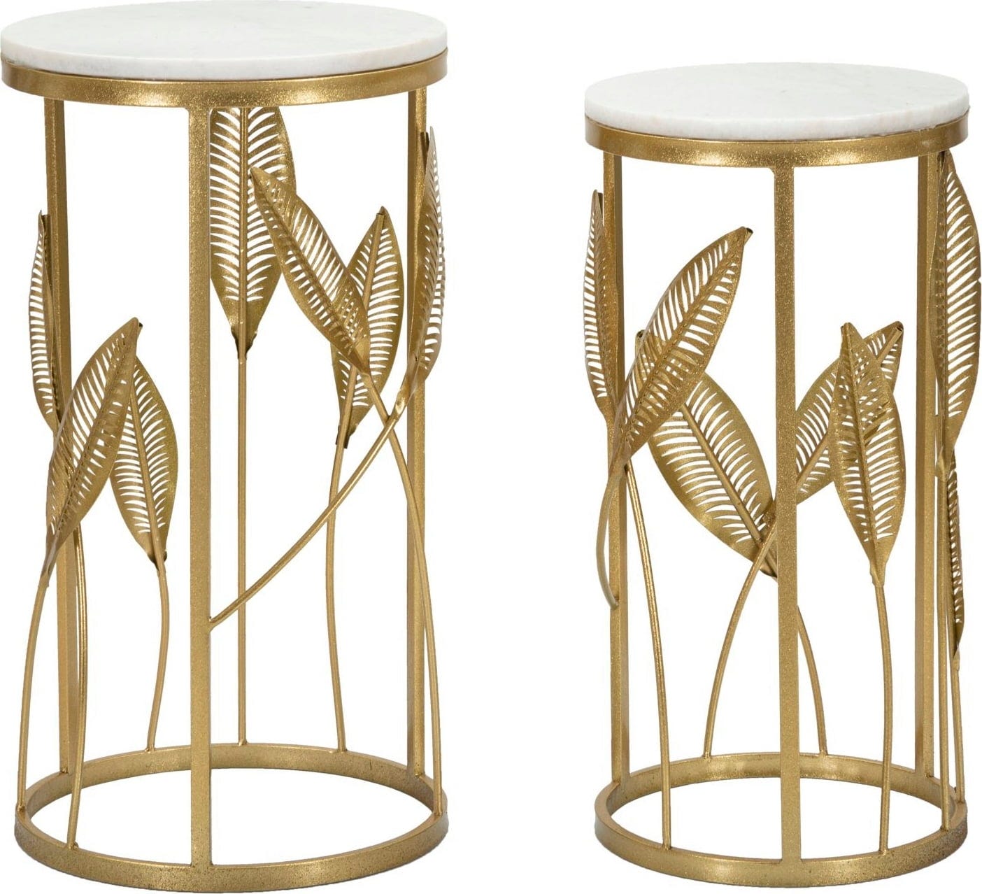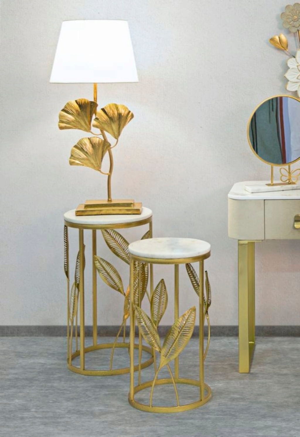 La structure en métal doré est ornée de feuilles finement travaillées, qui s’élancent élégamment le long des montants. Le tout est complété par un plateau effet marbre blanc, créant un contraste classique avec la chaleur du doré. En duo ou séparément : ce set apporte une signature unique à chaque pièce.