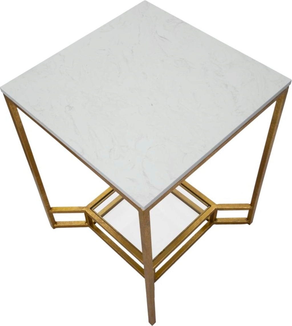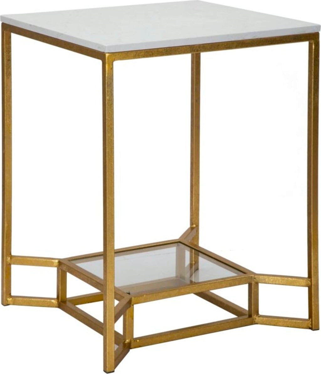 Le plateau supérieur, en marbre blanc synthétique, offre une surface d’appoint luxueuse, tandis que l’étagère inférieure en verre transparent apporte une légèreté visuelle et un espace de rangement supplémentaire. L’harmonie entre doré brillant, verre froid et effet marbre naturel.