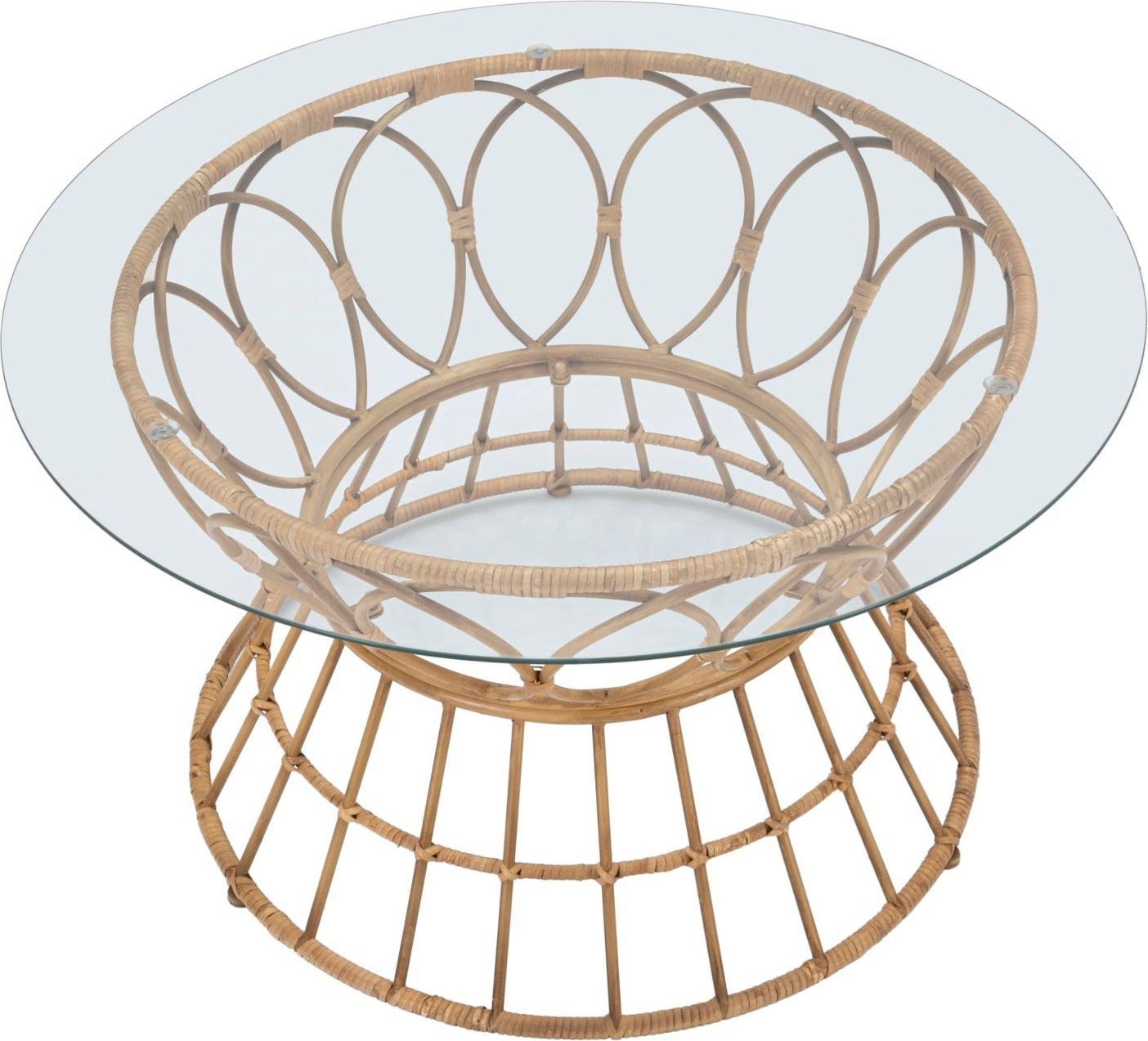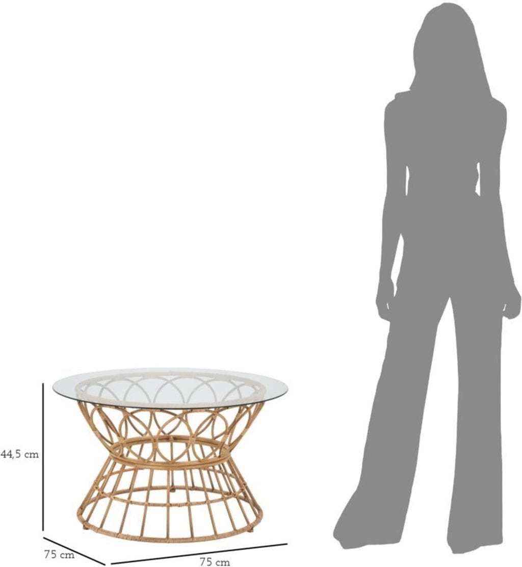 La structure en métal, avec une finition effet rotin de qualité, adopte une silhouette de sablier marquée, rehaussée d’éléments circulaires entrelacés qui captent le regard. Un grand plateau en verre transparent couronne l’ensemble, laissant apparaître la finesse du motif et ajoutant une belle transparence. Grâce à son langage formel intemporel, Panama Circle s’intègre aussi bien dans un univers Boho-Chic que dans un intérieur loft contemporain.