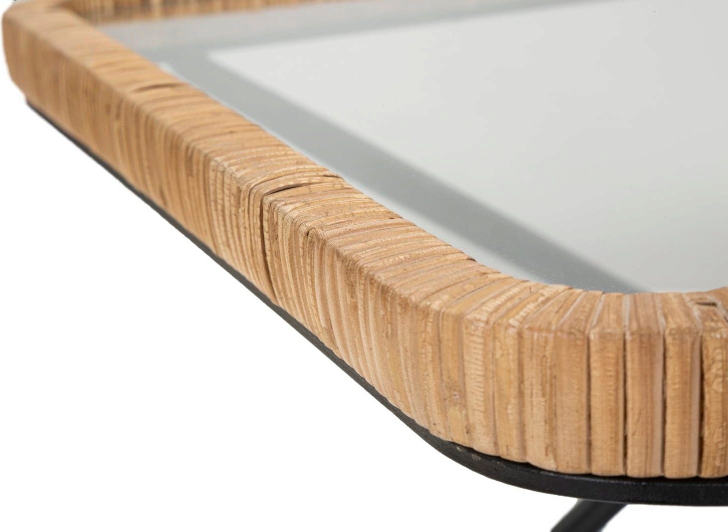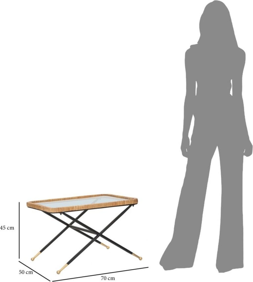 Offrez à votre salon une touche de design simple mais esthétique avec cette table basse rectangulaire ! Elle allie la transparence épurée d'un plateau en verre rectangulaire à la texture chaleureuse et naturelle d'un tressage en rotin qui encadre élégamment le plateau. La structure métallique noire robuste, avec ses pieds en forme de X, assure une grande stabilité et un contraste moderne.