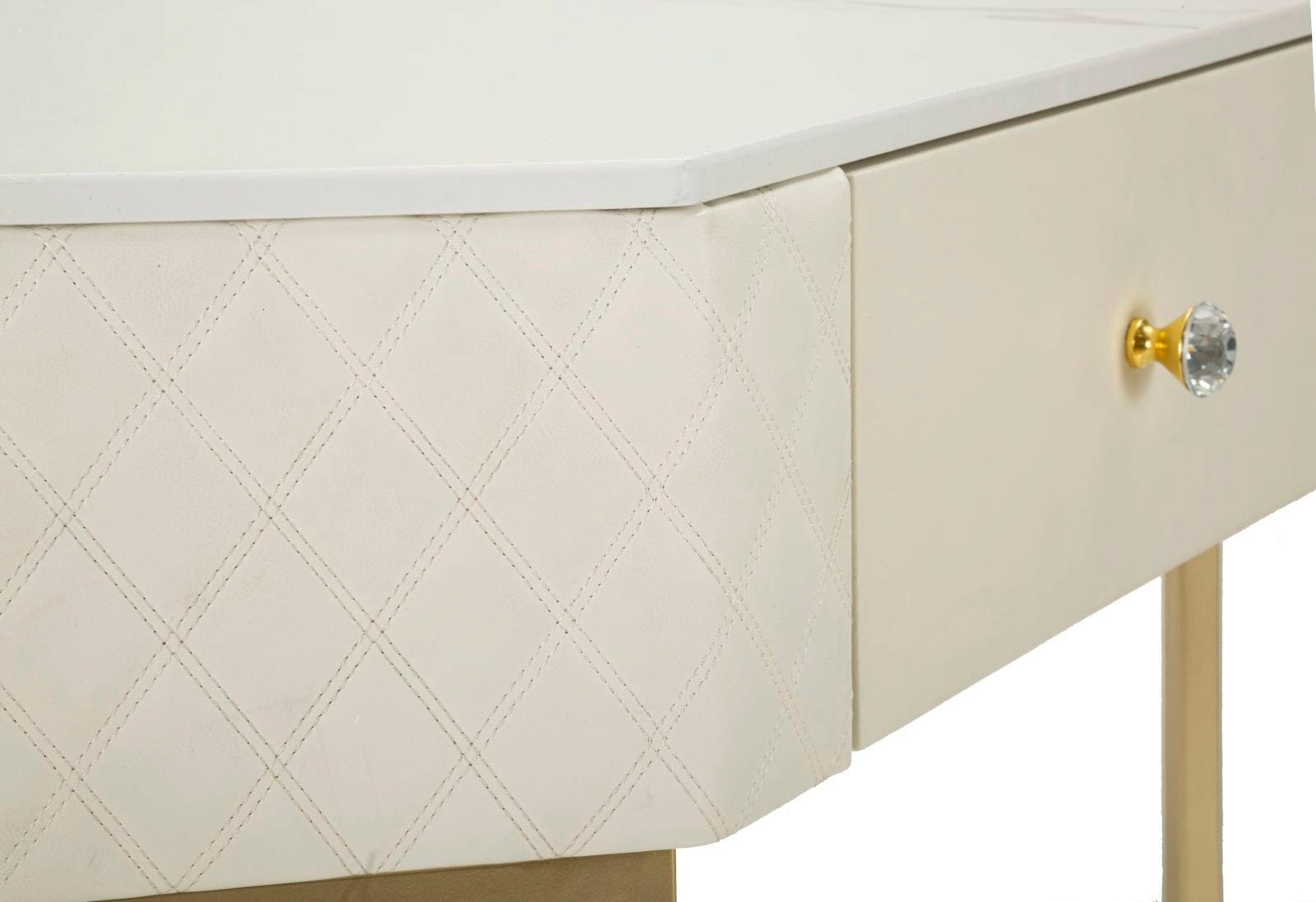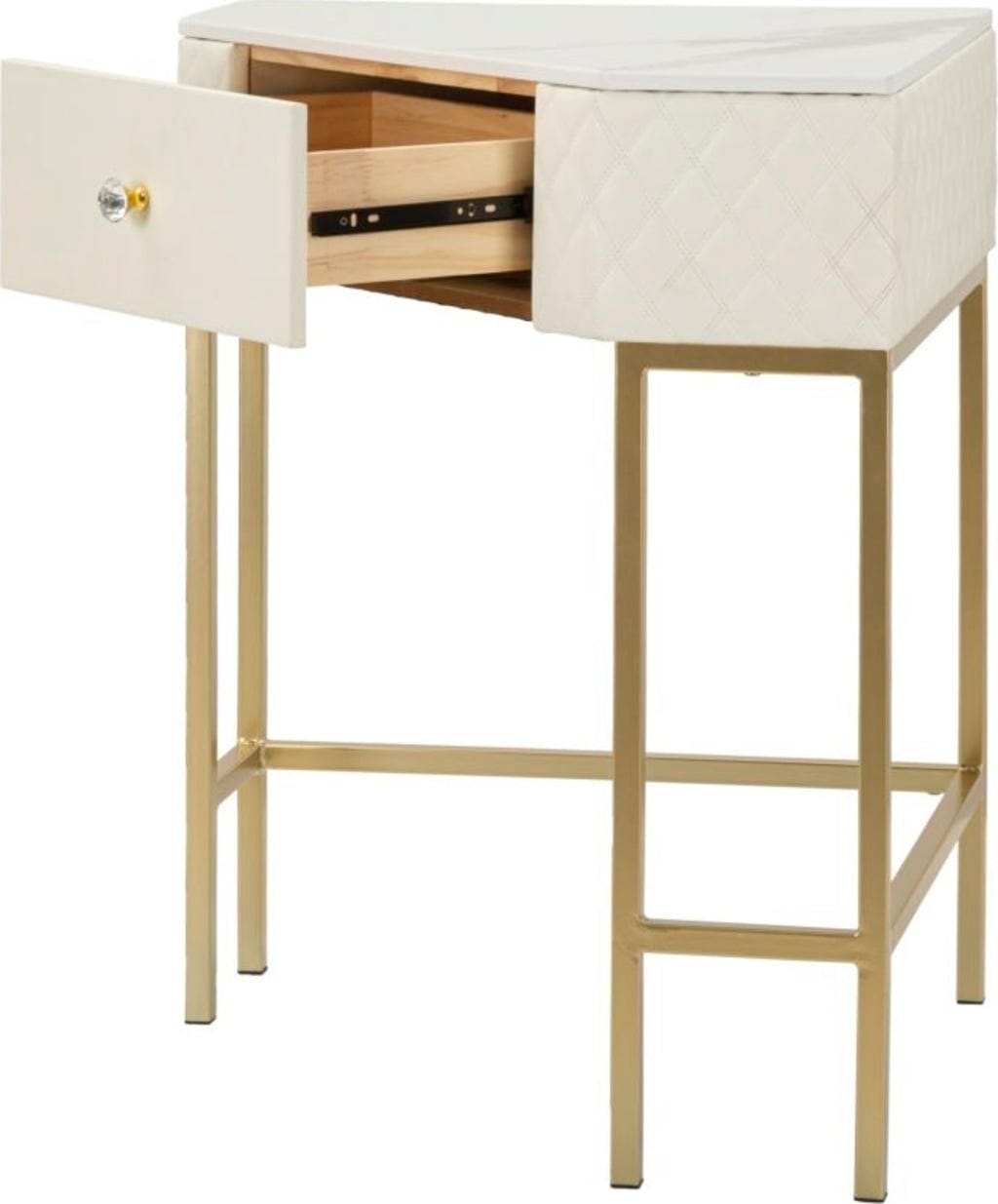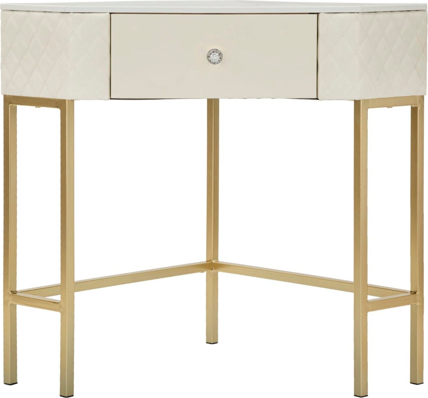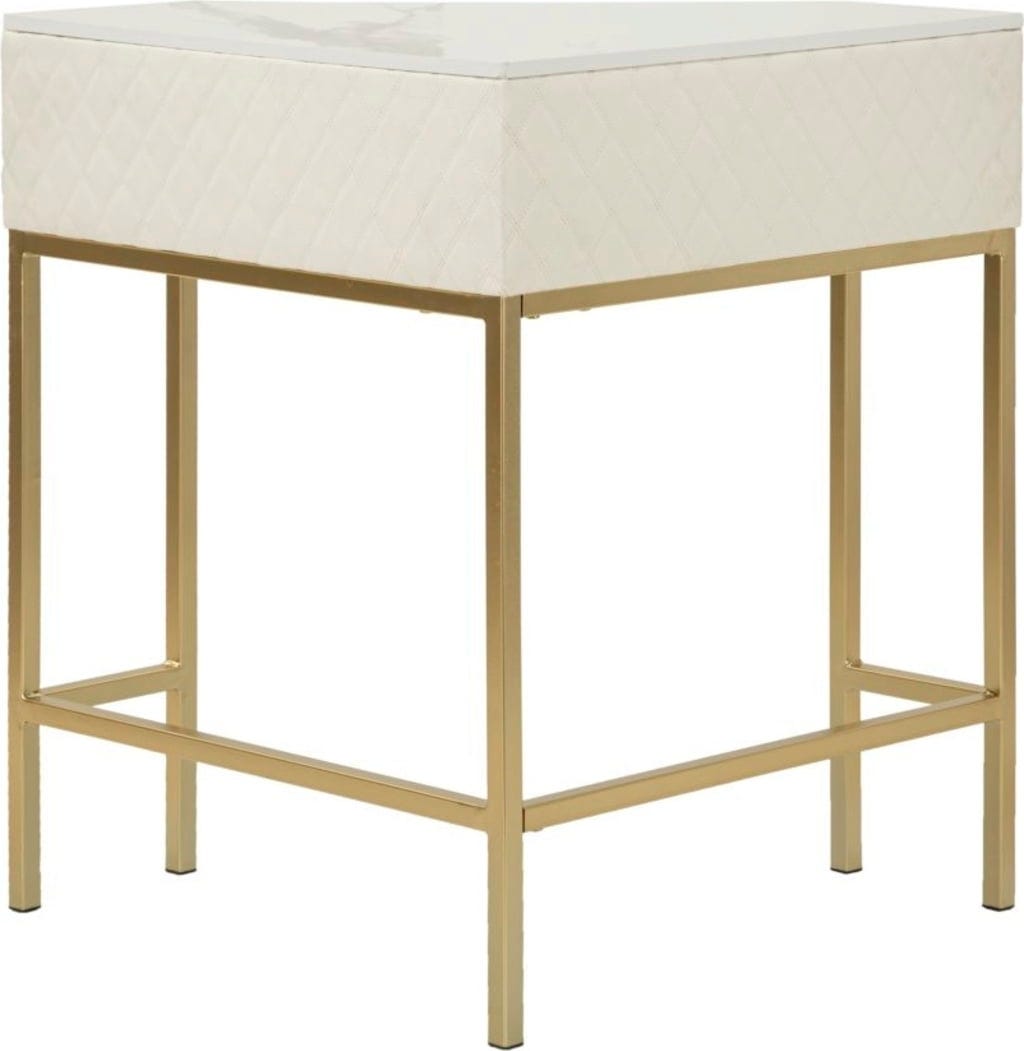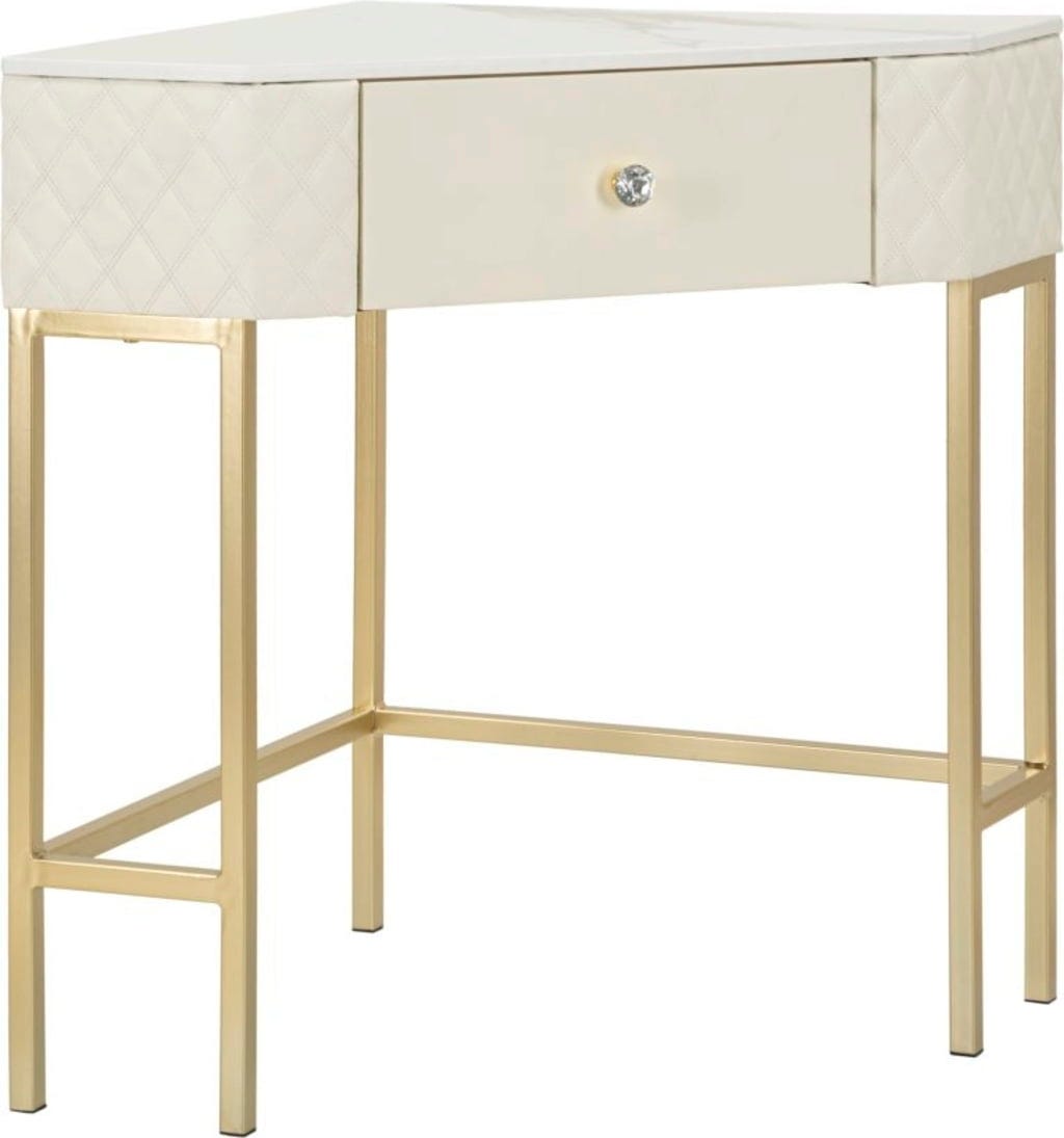 Utilisez les coins de votre pièce avec style grâce à cette console d'angle luxueuse. Son design triangulaire est la solution parfaite pour gagner de la place, alliant élégance suprême et fonctionnalité. Le plateau de table à l'aspect marbre raffiné et les côtés recouverts de cuir synthétique matelassé créent immédiatement une atmosphère opulente.