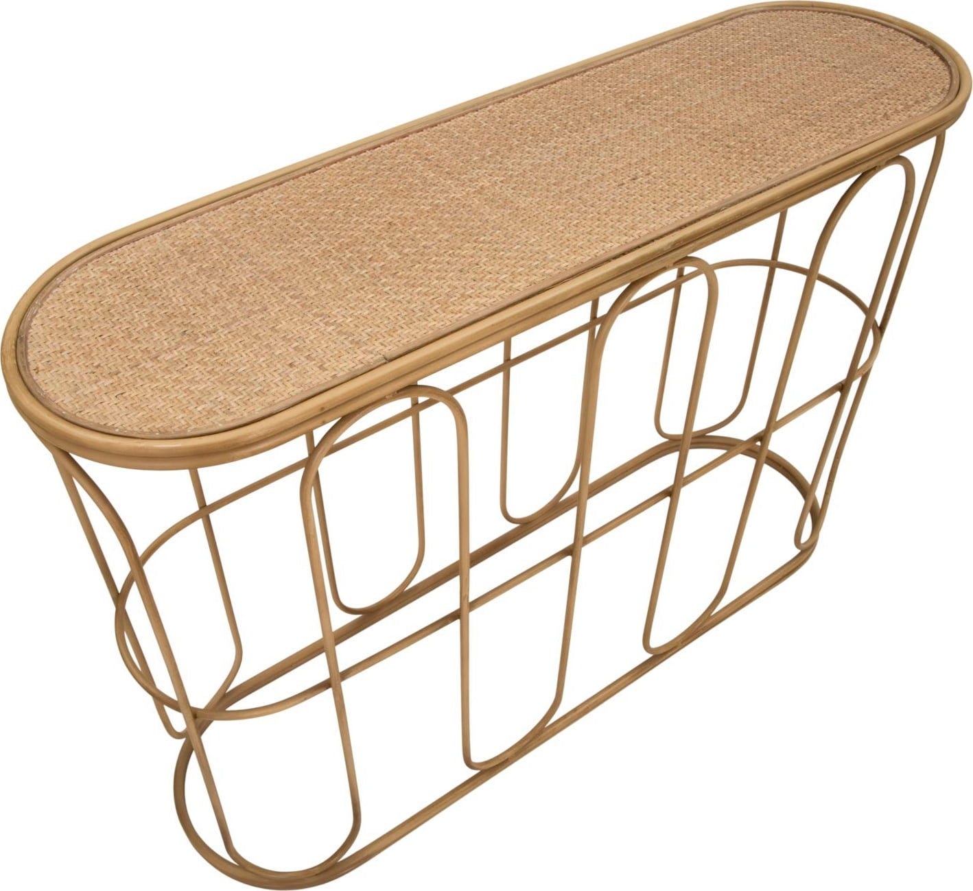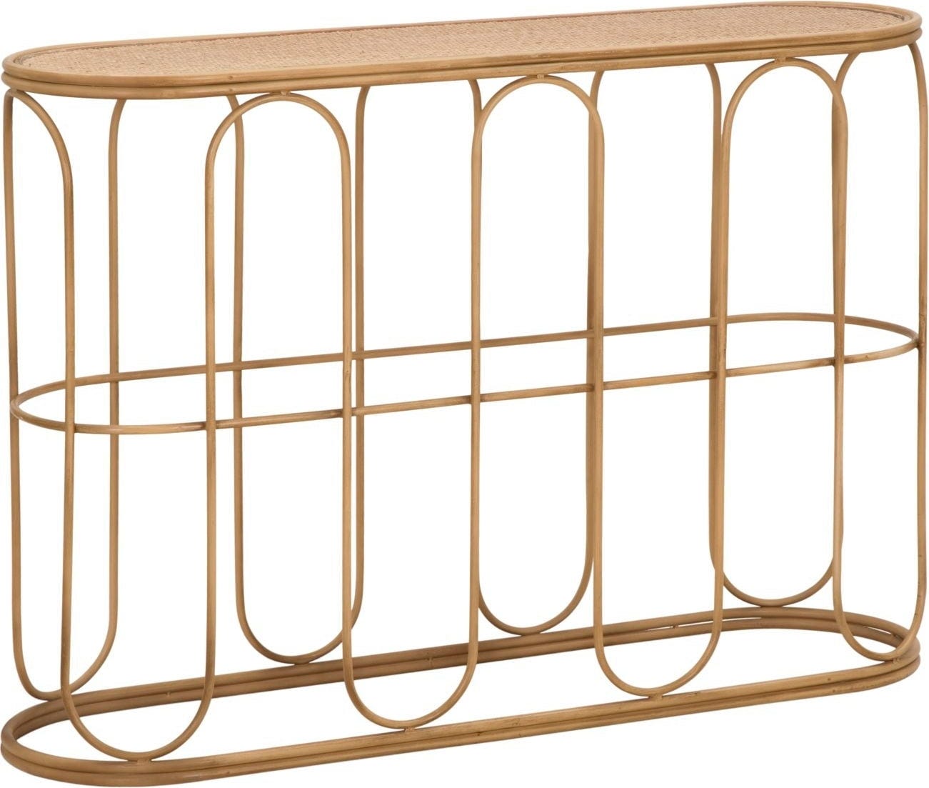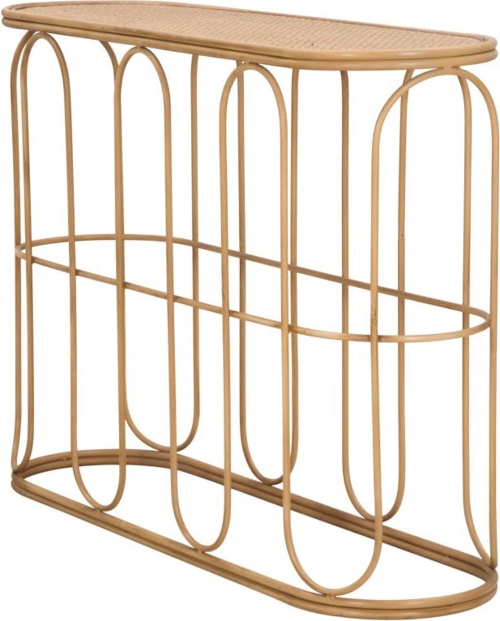 Donnez une atmosphère chaleureuse et accueillante à votre entrée ou à votre salon avec cette élégante console ! Son design s'inspire de matériaux naturels et se distingue par des lignes douces et courbées, ainsi que des côtés arrondis. La structure haute est en métal et imite habilement l'aspect de tubes de bambou. Le plateau ovale est recouvert d'un fin tressage en rotin.