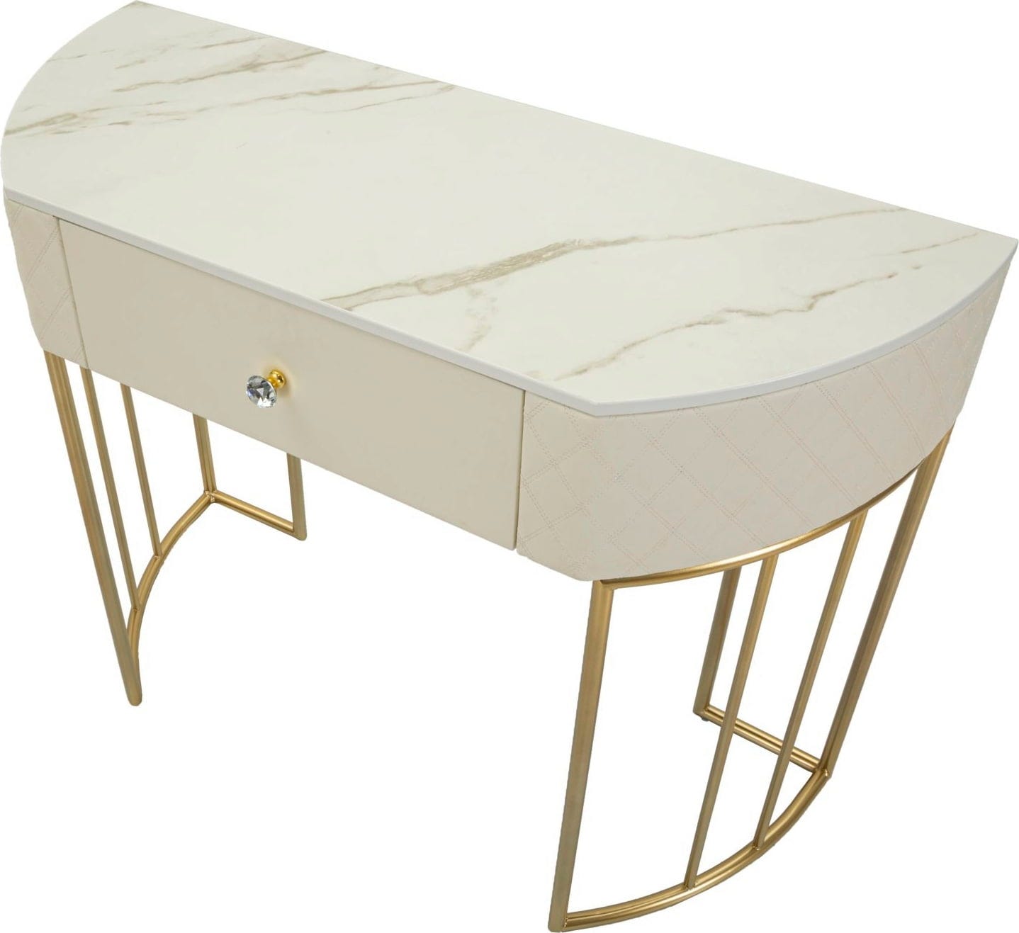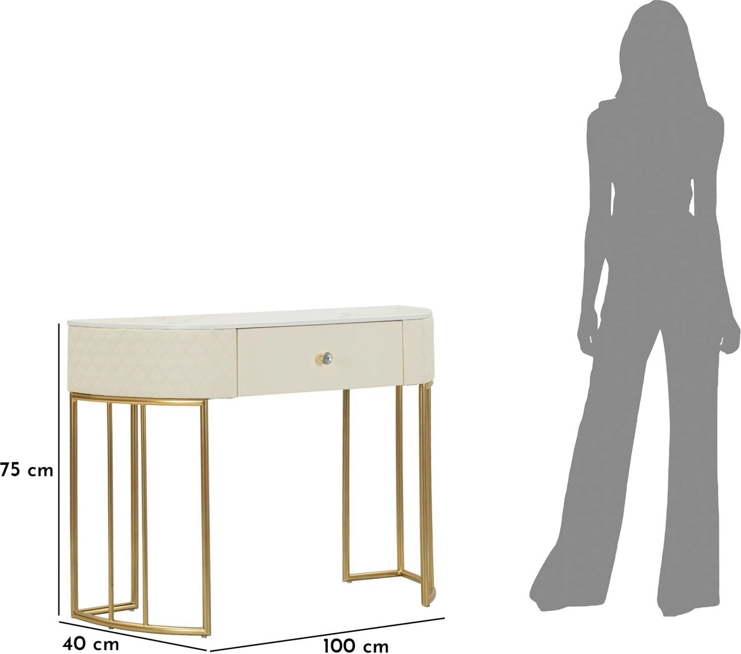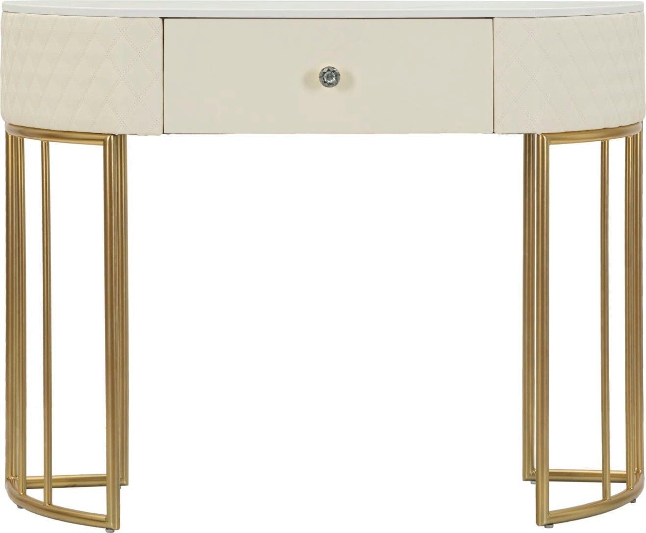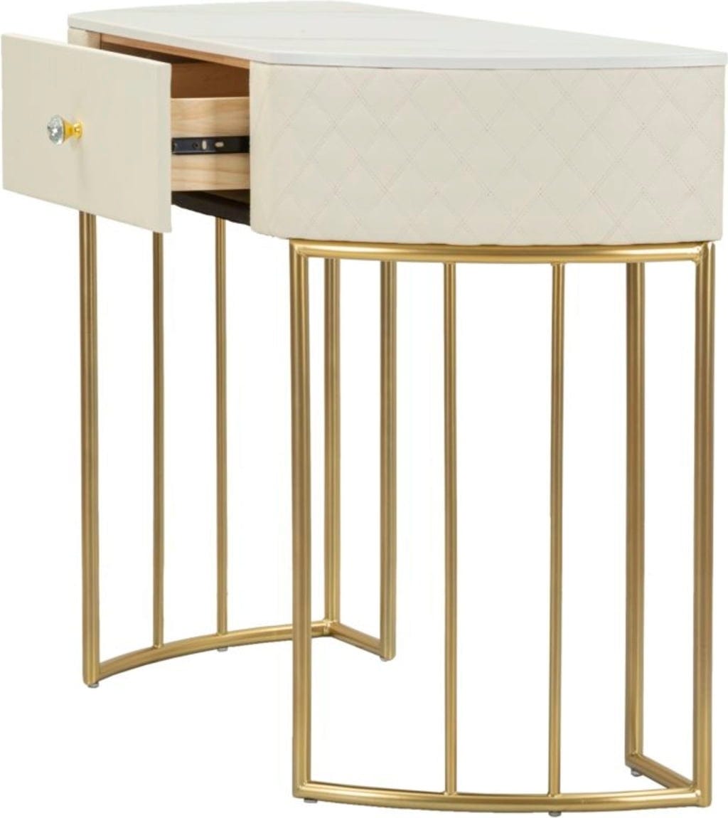 Le tiroir central, orné d'un bouton design et brillant, offre un espace de rangement discret pour les clés ou les petits objets. La console repose sur une structure métallique dorée et délicate, qui souligne avec style son allure contemporaine. Ce meuble élégant est idéal pour mettre en valeur vos objets décoratifs et apporter une note sophistiquée à chaque pièce.