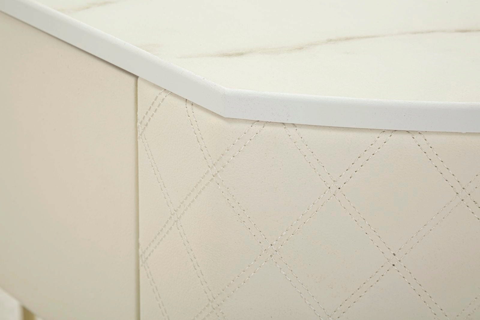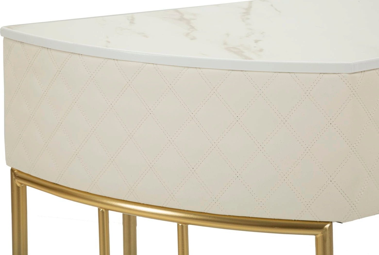 Apportez une touche de luxe moderne et d'élégance discrète à votre entrée ou à votre salon avec cette console murale élégante. Sa forme semi-circulaire est sublimée par une surface luxueuse : les côtés sont recouverts de similicuir matelassé doux, de couleur blanc crème, offrant une texture perceptible et raffinée.