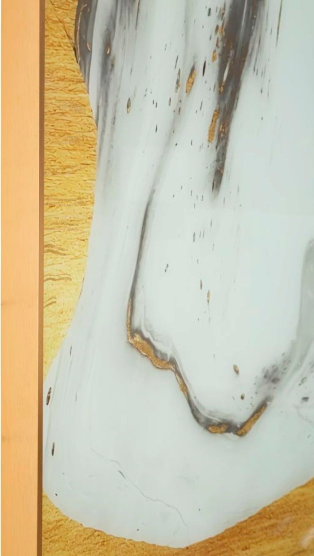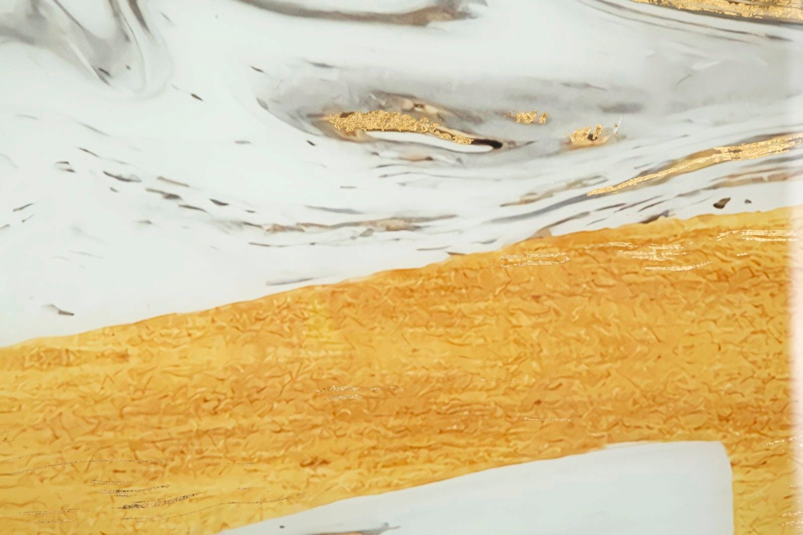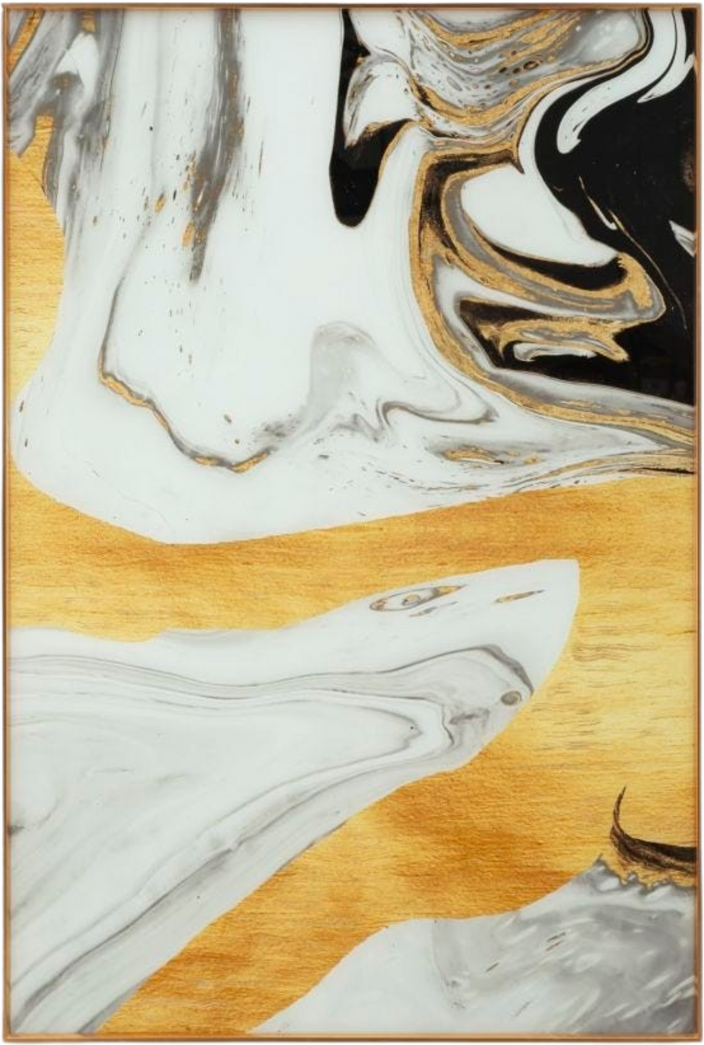 Encadrée d’un cadre métallique doré, sobre, l’œuvre paraît particulièrement haut de gamme et moderne. La surface brillante du verre met en valeur les textures fines et les détails dorés, faisant de Ghostly un point focal idéal pour un intérieur exigeant.