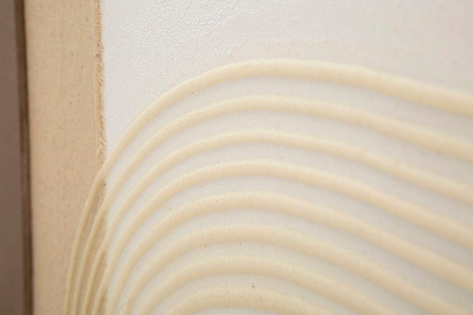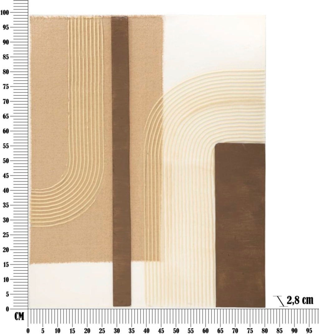 Le visuel joue avec formes géométriques et textures naturelles : des bandes verticales dans différents tons de brun rencontrent des zones de toile claire. Le point fort réside dans les applications en relief, réalisées avec de fines cordelettes crème, qui dessinent des courbes douces et donnent à l’ensemble une tridimensionnalité fascinante. Montée sur un châssis en bois stable, cette pièce unique apporte un esprit galerie contemporain à votre intérieur.