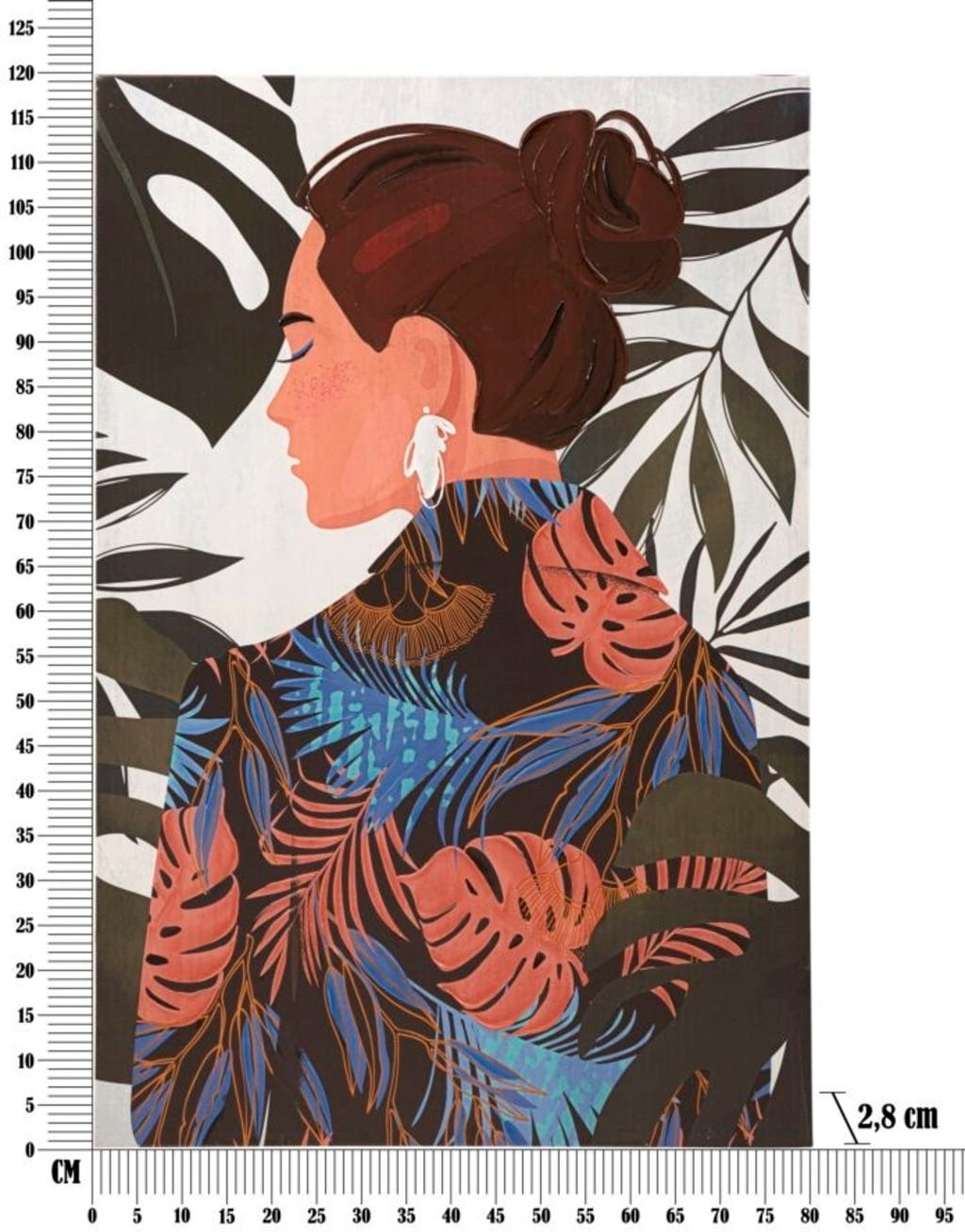 Le motif montre une femme vue de dos, les cheveux relevés avec élégance, devant une toile de fond de feuilles de jungle contrastées. Le jeu des couleurs est particulièrement fascinant : sa tenue au motif travaillé associe des tons terracotta chaleureux à des nuances de bleu plus froides, tandis que les feuilles de monstera, à l’arrière-plan, créent des accents en vert foncé et blanc lumineux. Montée sur un châssis en bois stable, cette pièce est un point focal exclusif pour celles et ceux qui aiment le design contemporain avec une touche d’évasion.