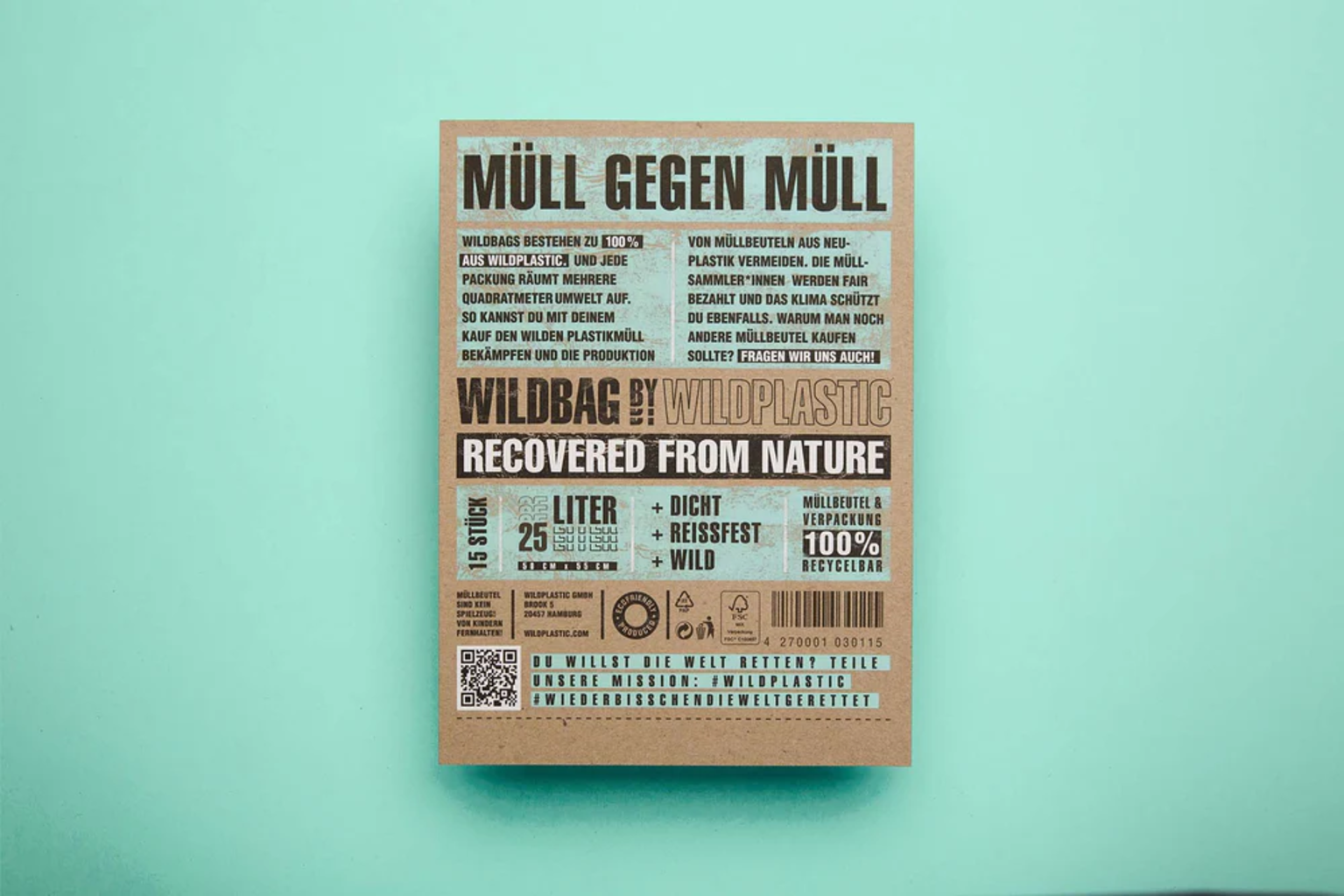 Ces sacs-poubelle sont fabriqués à partir de "plastique sauvage" et conviennent parfaitement aux petites poubelles de salle de bain, de bureau ou de cuisine. Le matériau est résistant à la déchirure et, afin d’éviter l’utilisation de plastique neuf, les Wildbags ne possèdent pas de cordon de serrage.