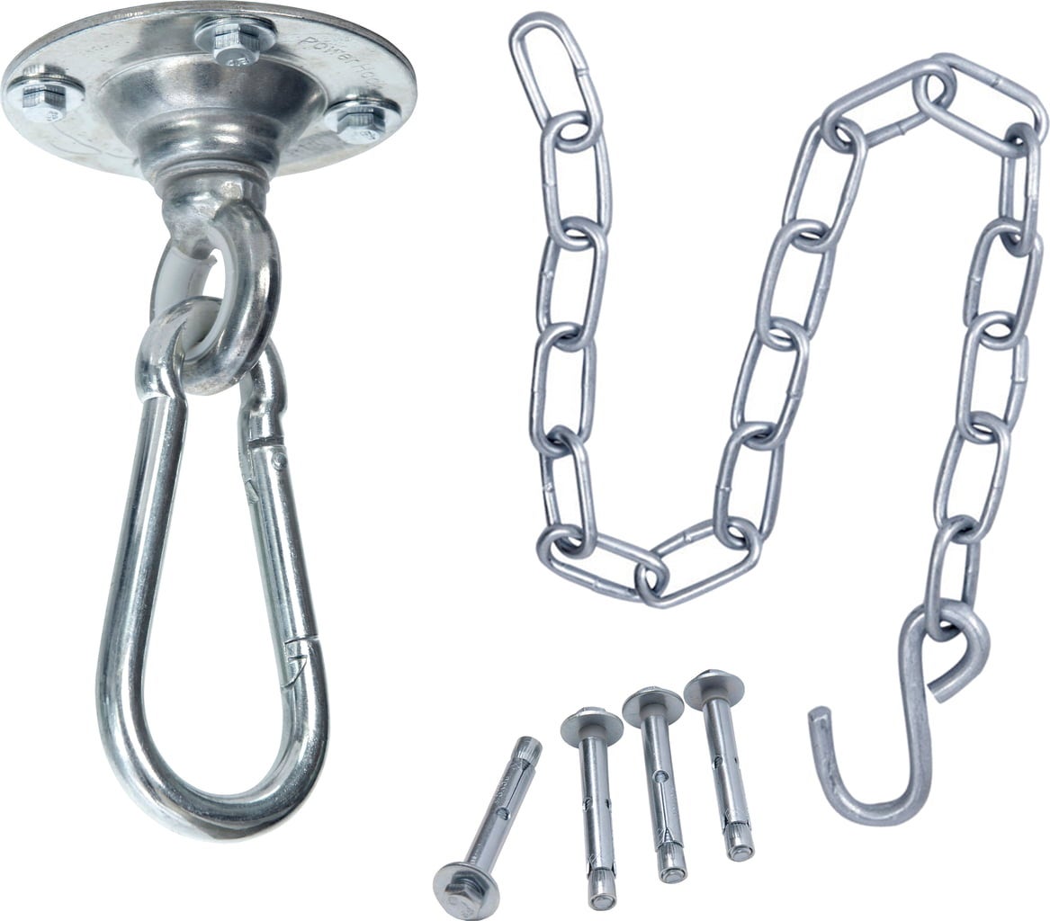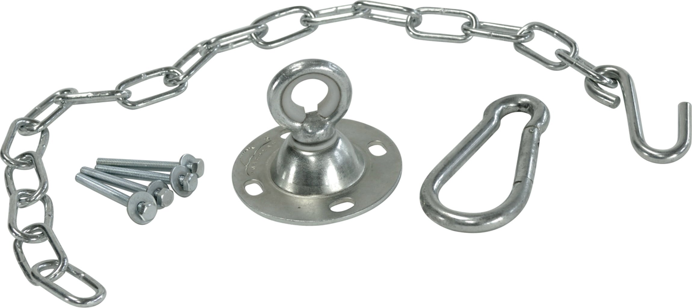 De levering bevat een robuuste speciale haak met geïntegreerde kogellager, een praktische karabijnhaak en een in hoogte verstelbare ketting zodat je de hoogte van je hangstoel kunt aanpassen. Er worden ook vier bijpassende schroeven en vier metalen pluggen meegeleverd.