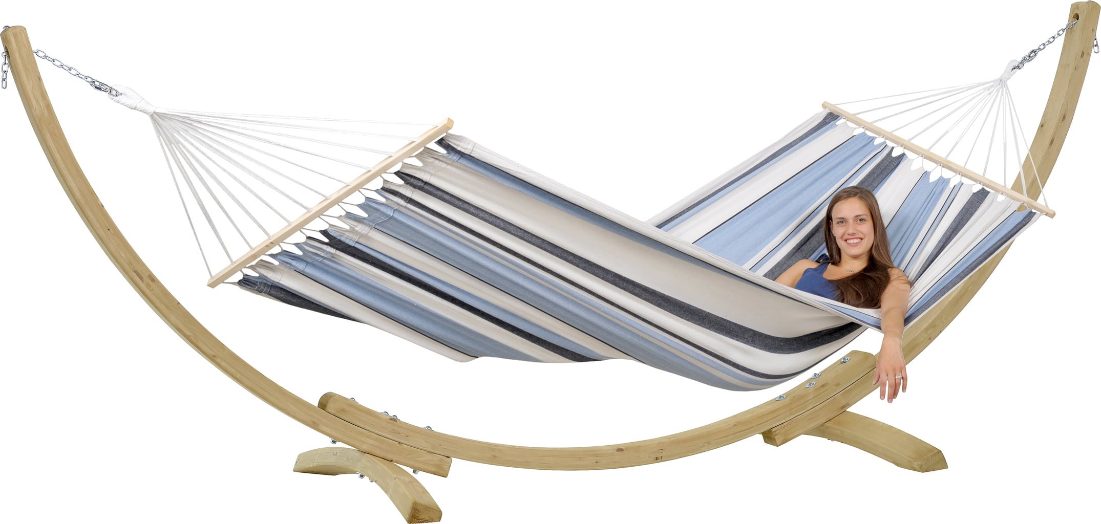 Verheug je op ontspannen uren in de buitenlucht! Met de set bestaande uit de Samba hangmat en het Apollo houten frame haal je je eigen persoonlijke feel-good paradijs in huis.