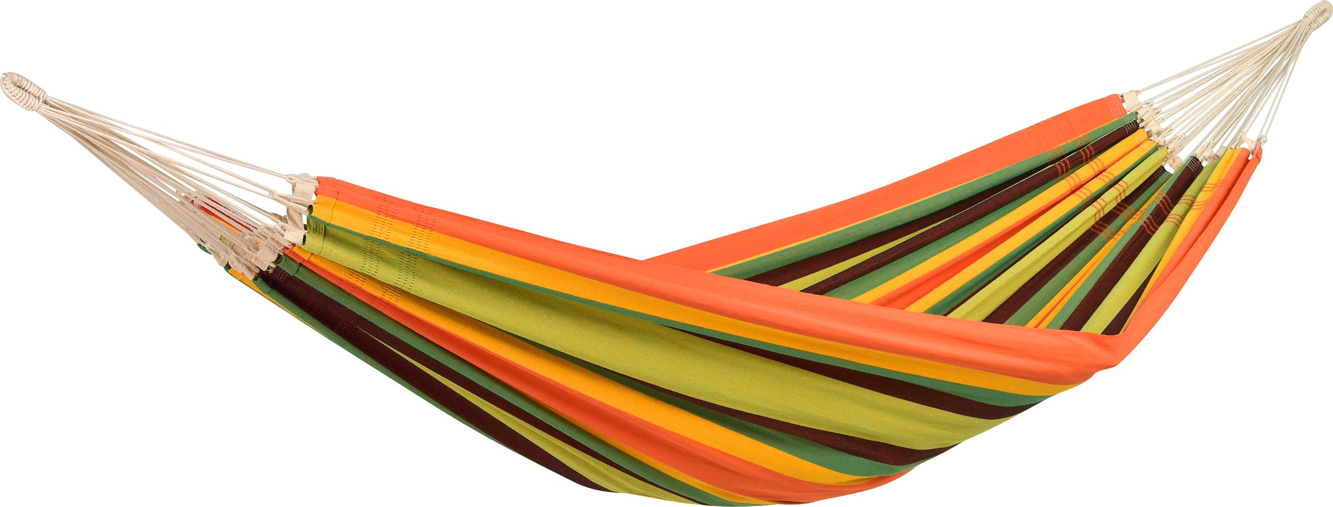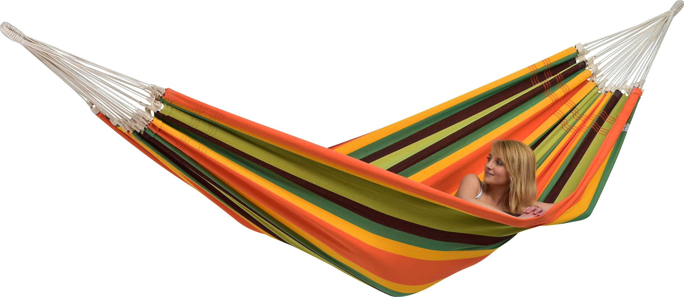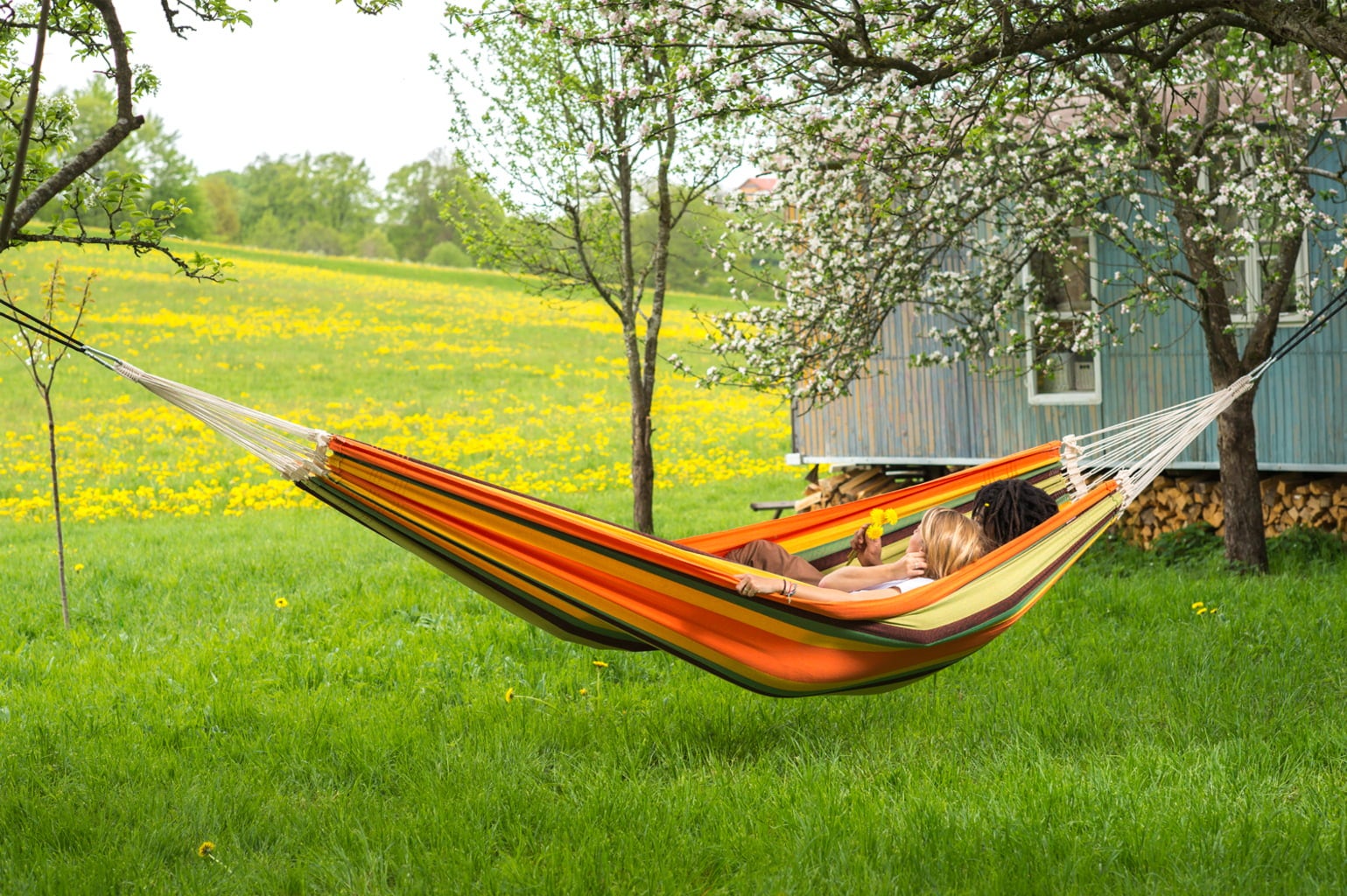 Je kunt de hangmat op de traditionele manier tussen twee bomen hangen of binnen je eigen vier muren aan twee muurhaken bevestigen. Hij kan in een handomdraai worden opgehangen en is klaar voor je ontspannen uurtjes. De hoogwaardige afwerking garandeert dat je jarenlang plezier hebt van je nieuwe favoriete hangmat. De handgeweven en dubbele 5-gestikte oogjes vormen een stabiele basis voor de vele ophangkoorden. Een bijzonder detail is het handgeweven lint dat in de ophangkoorden is verwerkt. Het zorgt niet alleen voor een visueel accent, maar egaliseert ook hoge punctuele belastingen en laat de hangmat perfect uitwaaieren.